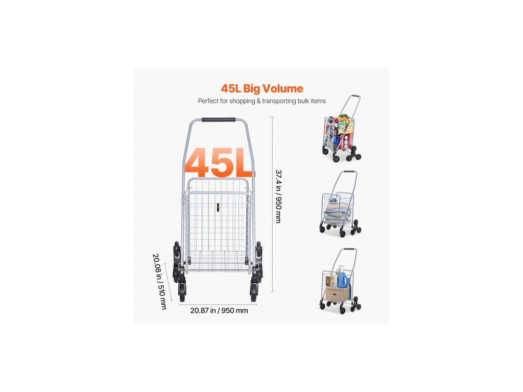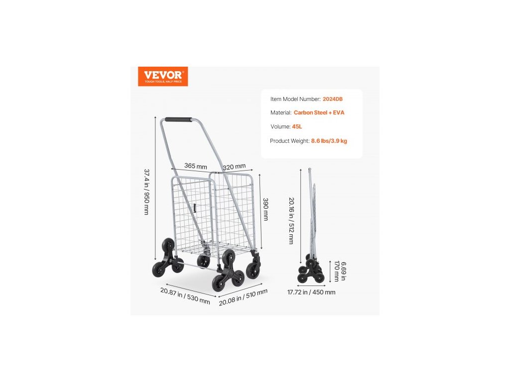 Nosnost na zemi: 40 kg, objem: 45 l, rozměry v plně rozloženém stavu: 510 x 530 x 950 mm, číslo modelu: 2024DB, průměr koleček na schody: φ3,66"/93 mm, hmotnost výrobku: 3,9 kg, rozměry ve složeném stavu: 112,5 cm x 20,87" x 9,06"/1120 x 530 x 230 mm,Materiál: Uhlíková ocel + EVA,Průměr univerzálního kola: φ3,94"/100 mm,Nosnost při stoupání: 60 lbs/27 kg
