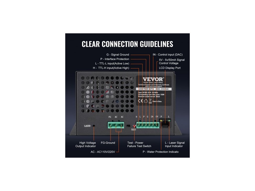 Napájecí zdroj pro CO2 laser , 150 W, napájecí zdroj pro 150W laserovou trubici, ochrana proti konstantnímu proudu, ochrana proti přerušení obvodu, rychlý odvod tepla, kompatibilní s laserovými gravírkami a řezacími stroji různých značek