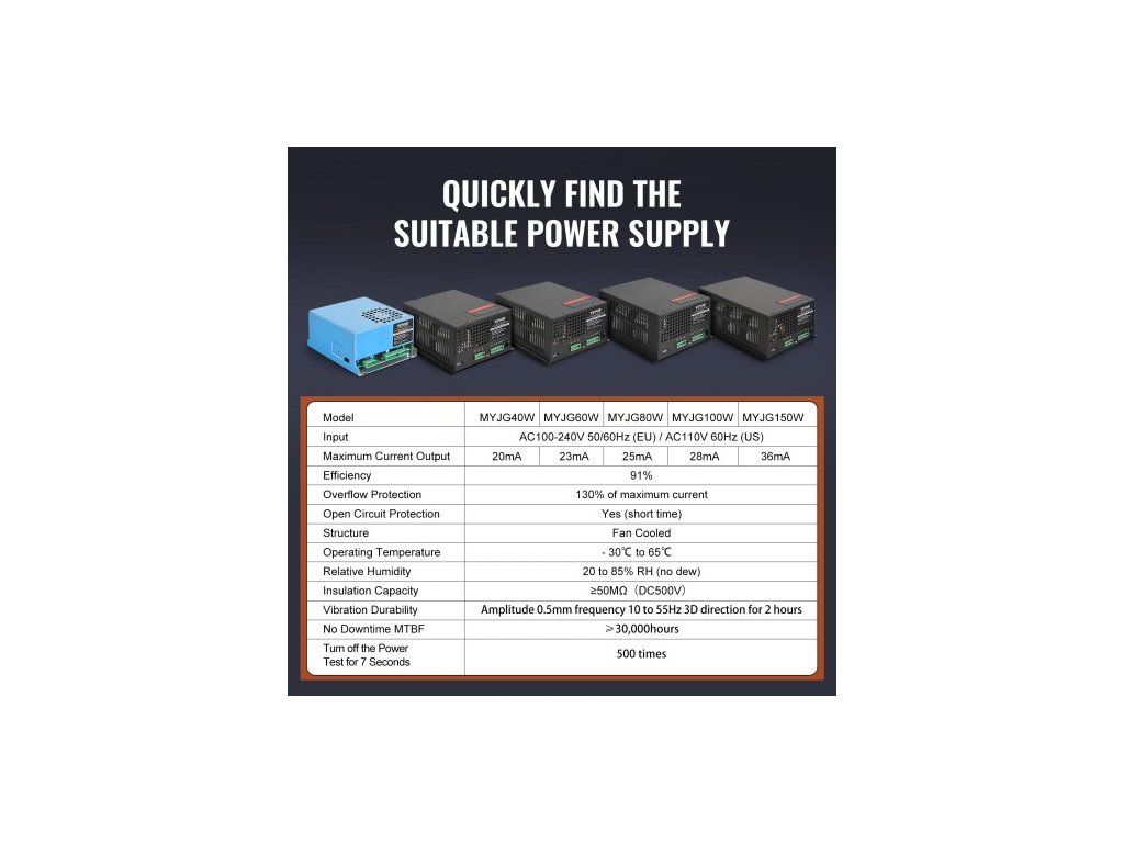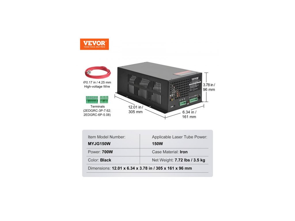 Provozní teplota: -30 ℃ až 65 ℃, Režim řízení: PWM řízení; Řízení pomocí úrovní TTL, Barva: Černá, Bezpečnostní opatření: Ochrana proti konstantnímu proudu, Ochrana proti přerušení obvodu, Velikost produktu: 12,01 ± 0,39 x 6,34 ± 0,2 x 3,78 ± 0,2 palce / 305 ± 10 x 161 ± 6 x 96 ± 6 mm, Životnost: 30000H, Napěťová frekvence: AC100 - 240V 50/60Hz, Číslo modelu položky: MYJG150W, Čistá hmotnost: 7,72 lbs / 3,5 kg ± 5 %, Vstupní proud: 4,5A ± 10 %, Hlavní materiál: Železo (pouzdro), Výkon produktu: 700 W ± 10 %, Odpovídající výkon laserové trubice: 150 W ± 10 %