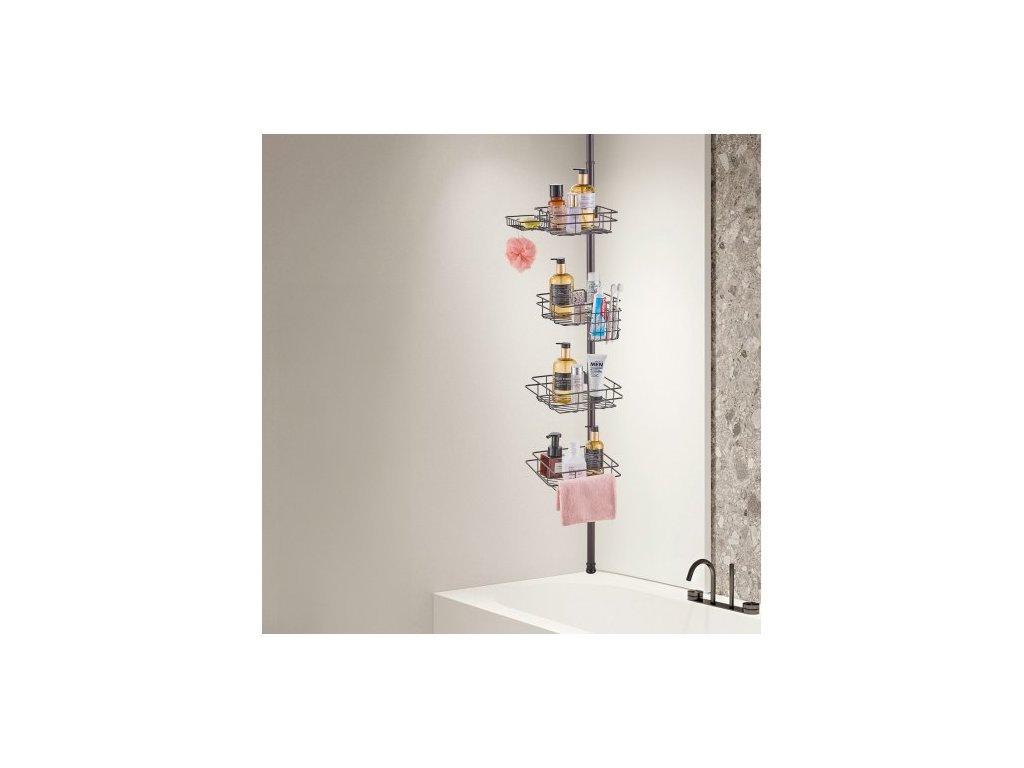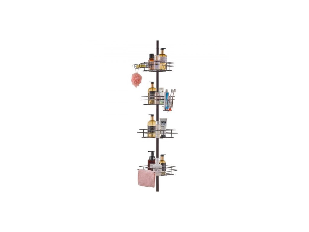 Napínací tyč do rohu sprchového koutu, výška 42" až 114", multifunkční napínací tyč do sprchy se silnou nosnou vaničkou, odolná proti korozi, snadno instalovatelná, vhodná do koupelny a toaletyÚhledná a organizovaná