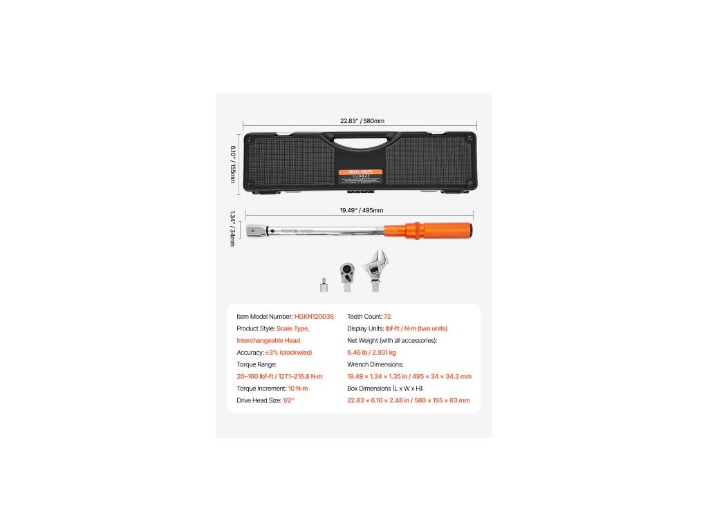 Přesnost: ±2 % (ve směru hodinových ručiček), Přírůstek momentu: 10 N.m, Počet zubů: 72, Zobrazované jednotky: lbf-ft / N.m (dvě jednotky), Číslo modelu položky: HGKN120035, Styl produktu: Typ stupnice, vyměnitelná hlava, Rozměry klíče: 19,49 x 1,34 x 1,35 palce / 495 x 34 x 34,3 mm, Čistá hmotnost (s veškerým příslušenstvím): 6,46 lb / 2,931 kg, Velikost hnací hlavy: 1/2", Rozsah točivého momentu: 20–160 lbf-ft / 27,1–216,8 Nm, Rozměry krabice (D x Š x V): 22,83 x 6,10 x 2,48 palce / 580 x 155 x 63 mm