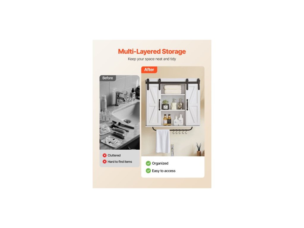 Nástěnná skříňka do koupelny, 2 dveře a nastavitelná police, úložná skříňka na lékárničku nad toaletu, nástěnný závěsný organizér s otevřenou přepážkou / držákem na ručníky / háčky do prádelny kuchyně, bíláNástěnná skříňka do koupelny