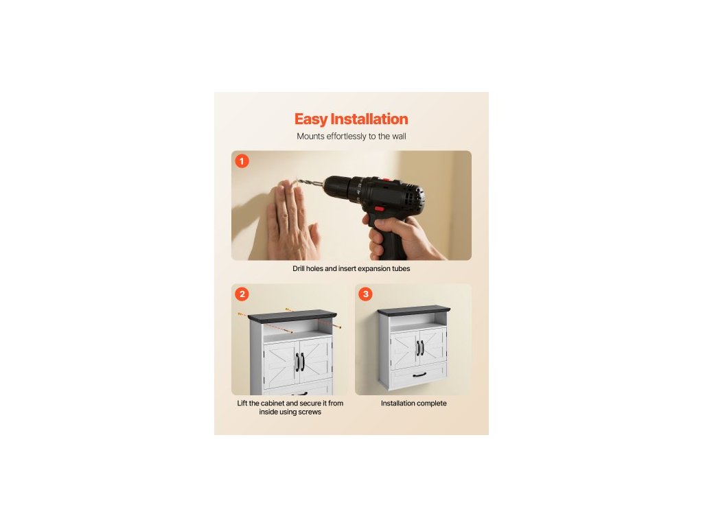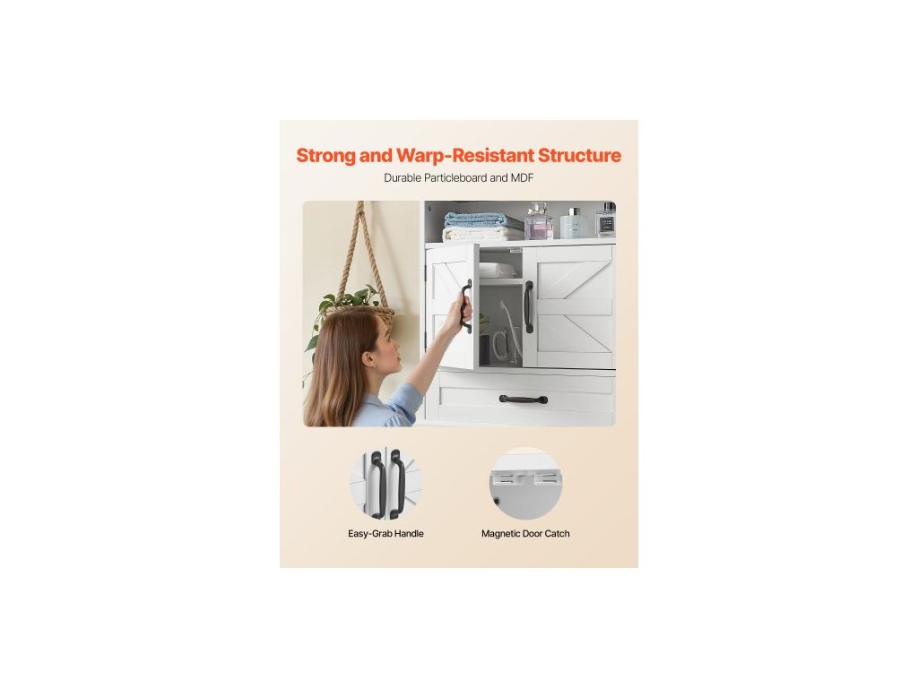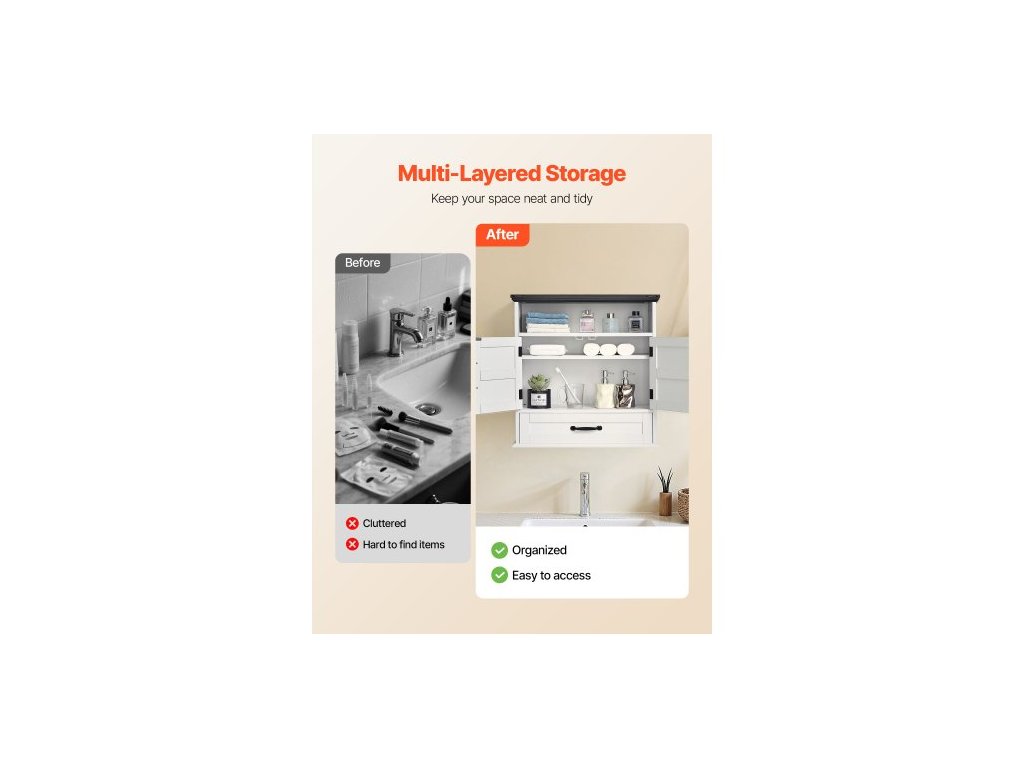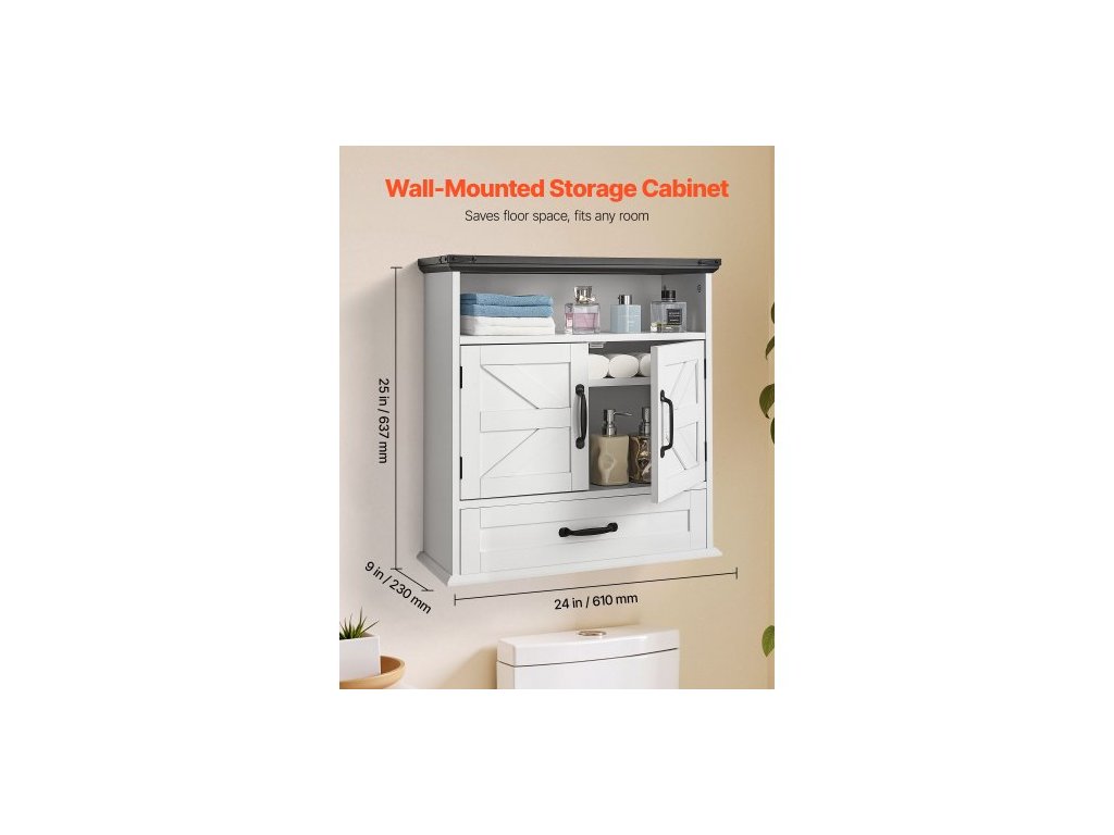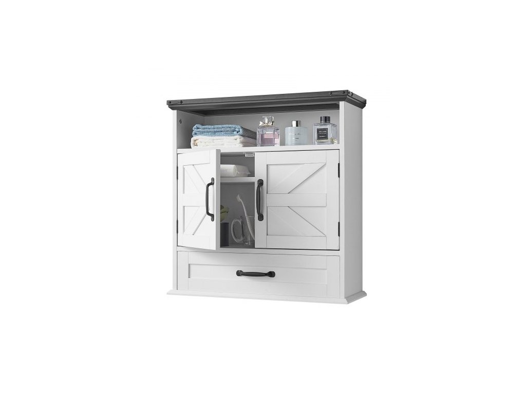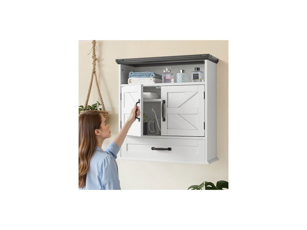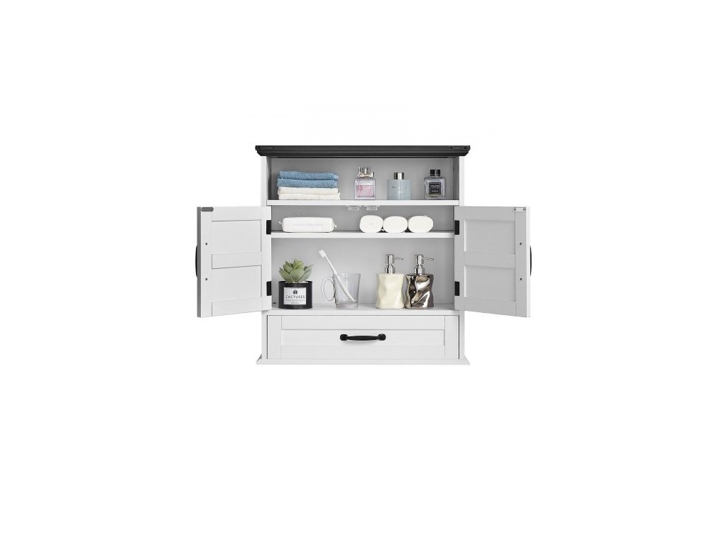Nástěnná skříňka do koupelny, 2 dveře a nastavitelná police, nad toaletu, úložná skříňka na lékárničky, nástěnná, závěsný organizér se šuplíkem a otevřenou přepážkou do prádelny, kuchyně, toalety, bílá
