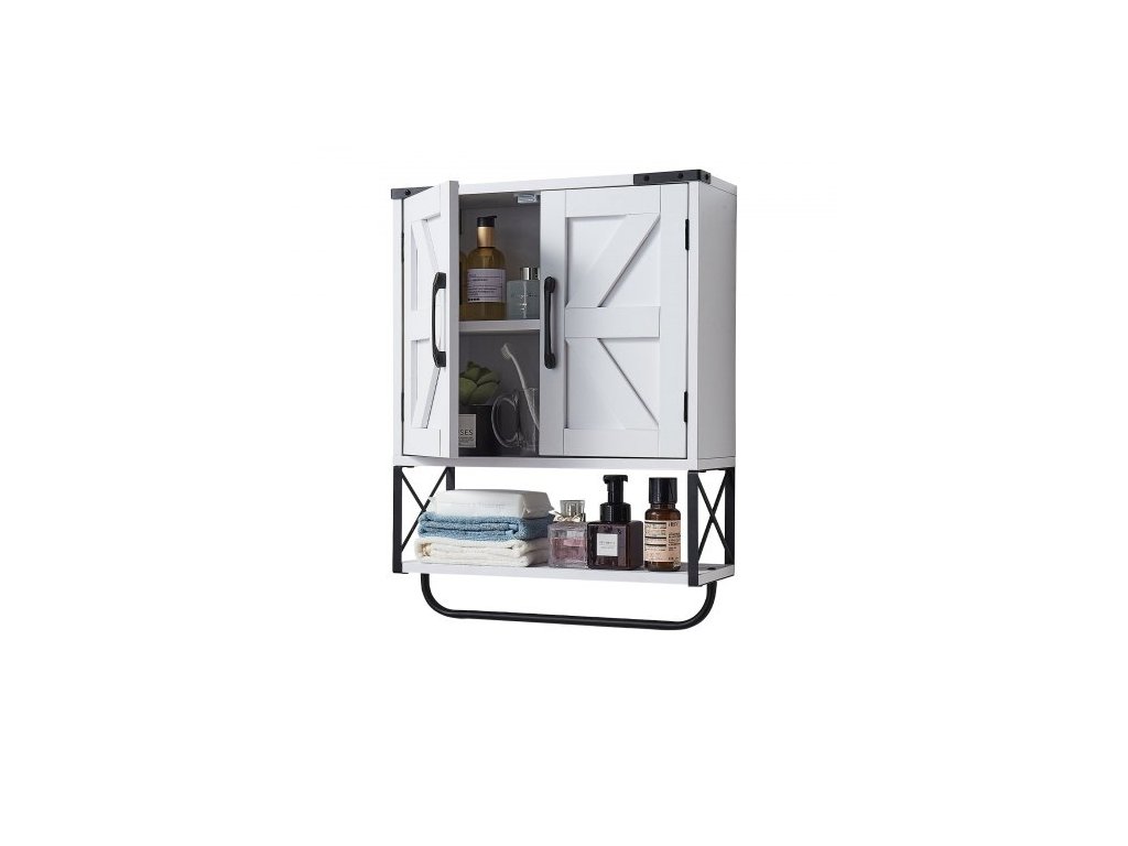 Koupelnová nástěnná skříňka, se 2 dvířky a nastavitelnou policí, úložná skříňka na léky nad toaletu, nástěnný závěsný organizér s otevřenou přepážkou a držákem na ručníky do kuchyně, bíláKoupelnová nástěnná skříňka