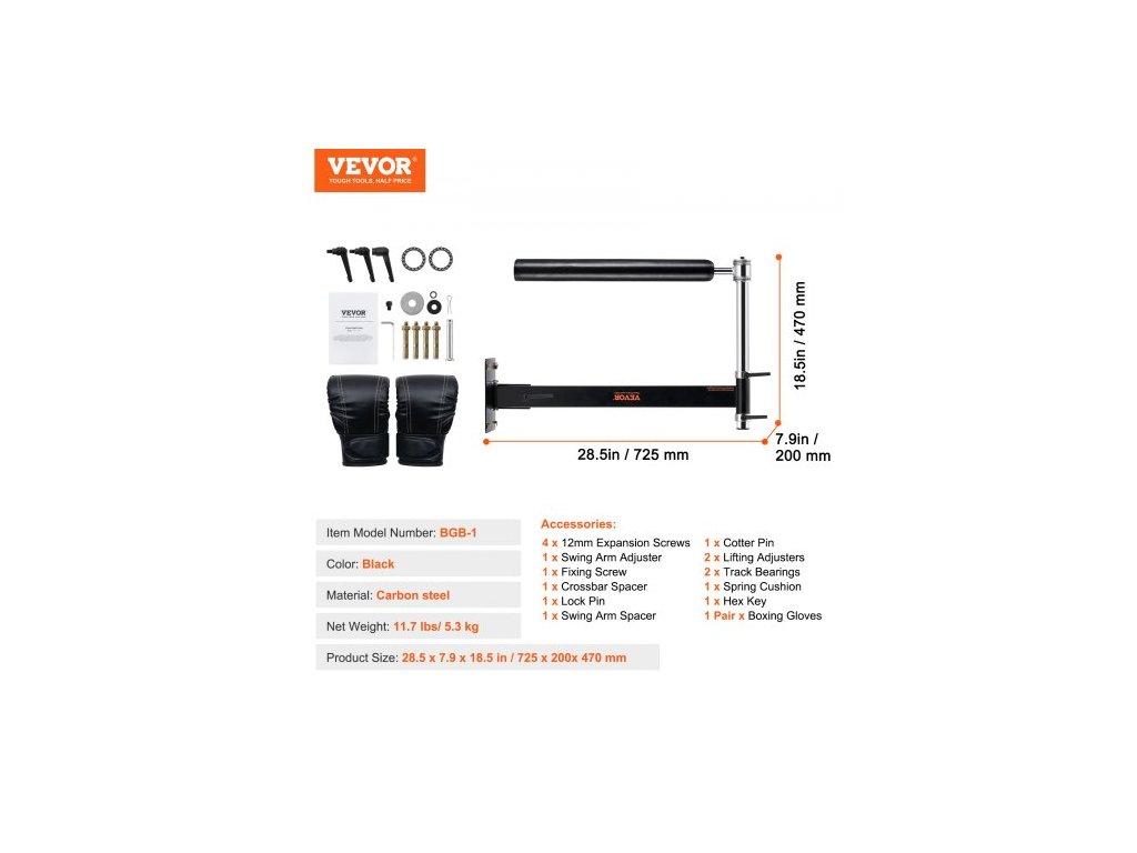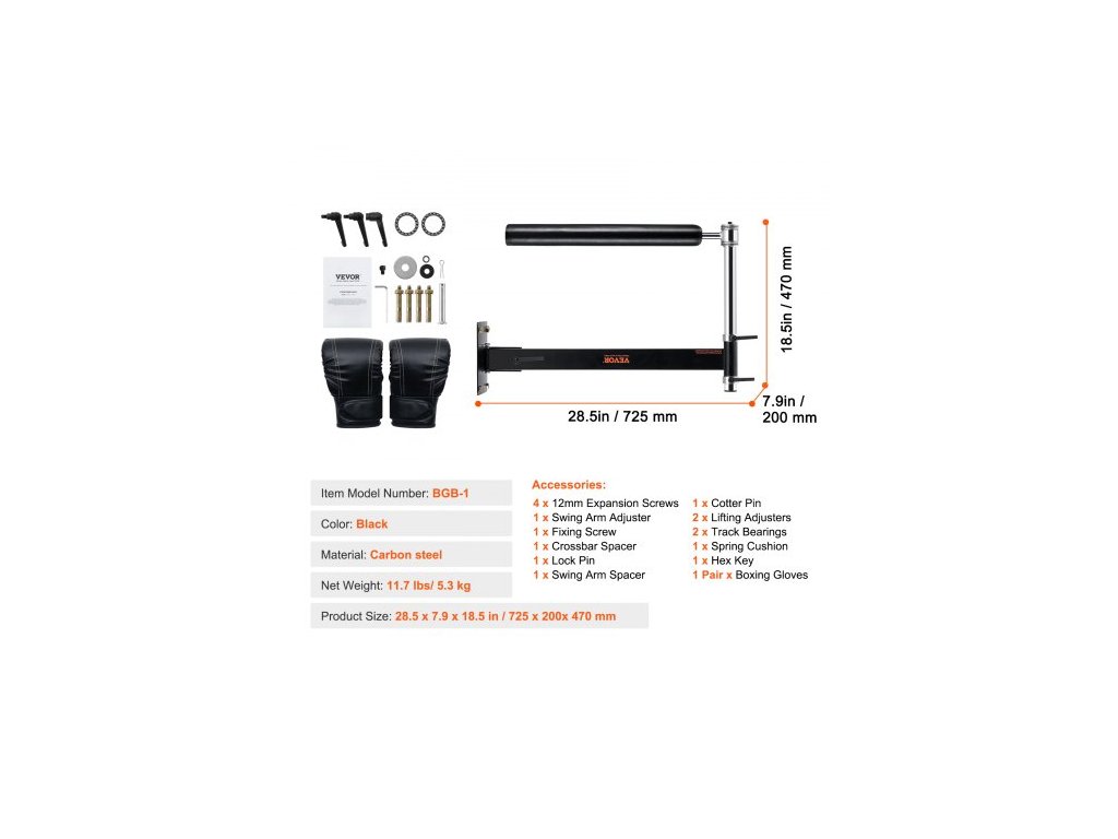 Barva: Černá,Číslo modelu položky: BGB-1,Materiál: Uhlíková ocel,Čistá hmotnost: 11,7 lbs / 5,3 kg,Rozměry výrobku: 28,5x7,9x18,5 palce / 725x200x470 mm