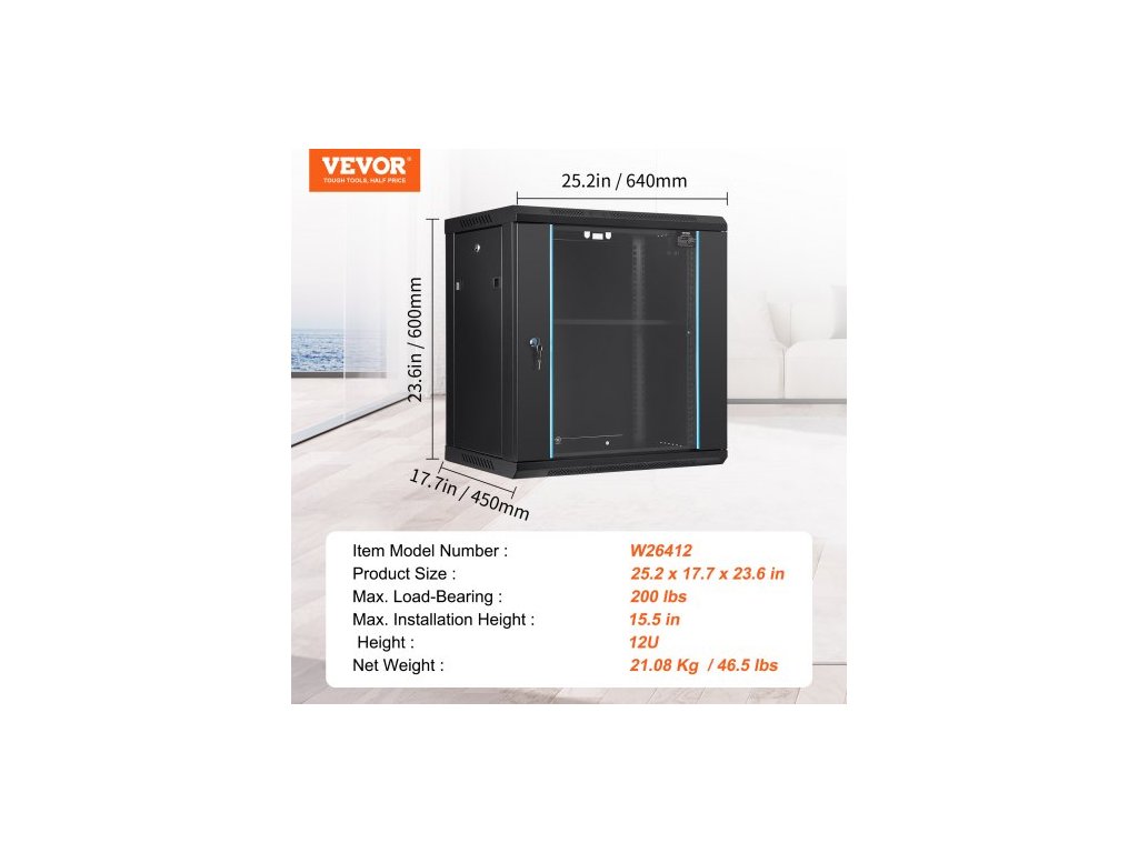 Barva: Černá, Číslo modelu položky: W26412, Výška: 12U, Standardní instalační šířka: 19 palců, Čistá hmotnost: 46,5 lbs/21,08 kg, Hloubka: 15,5 palců, Nosnost při montáži na stěnu: 100 lbs, Nosnost při montáži na zem: 200 lbs, Rozměry výrobku: 25,2 x 17,7 x 640 × 450 × 600 mm