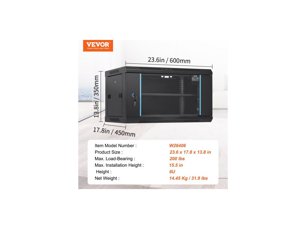 Barva: Černá,Číslo modelu položky: W26406,Výška: 6U,Standardní instalační šířka: 19 palců,Čistá hmotnost: 31,9 lbs / 14,45 kg,Hloubka: 15,5 palců,Nosnost pro montáž na stěnu: 100 lbs,Nosnost pro montáž na zem: 200 lbs,Rozměry výrobku: 13,8 x 17,8 x 23,6 palců / 350 x 450 x 600 mm