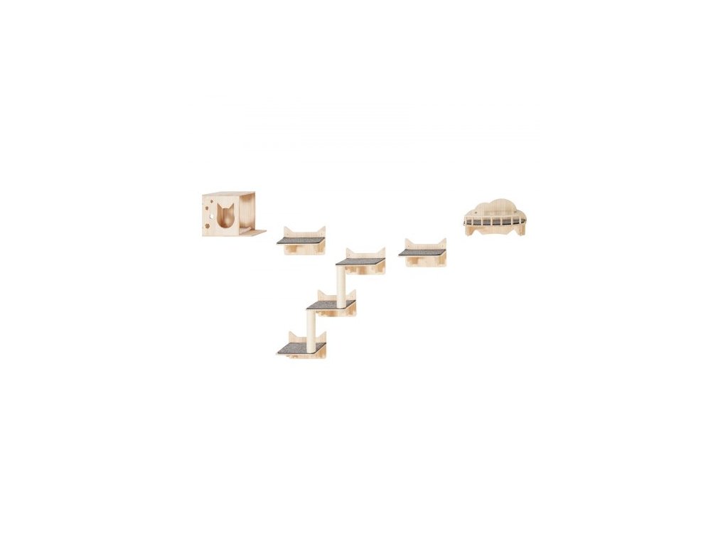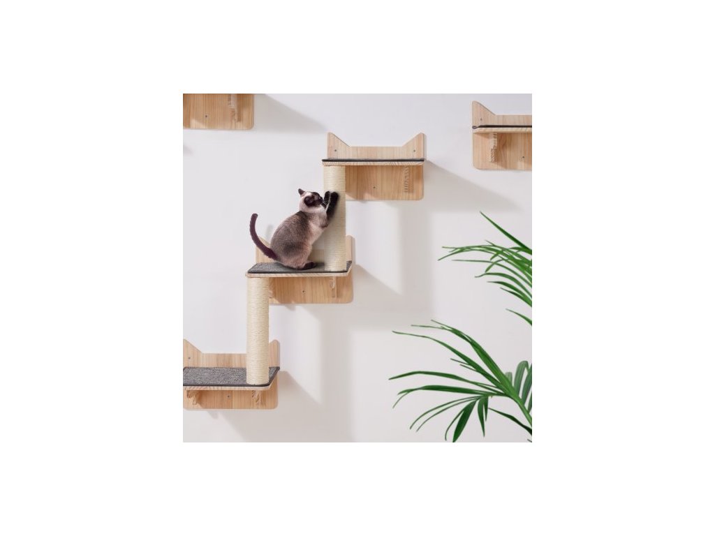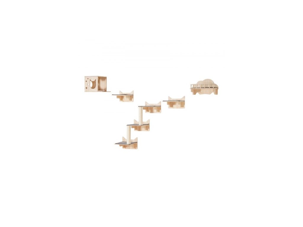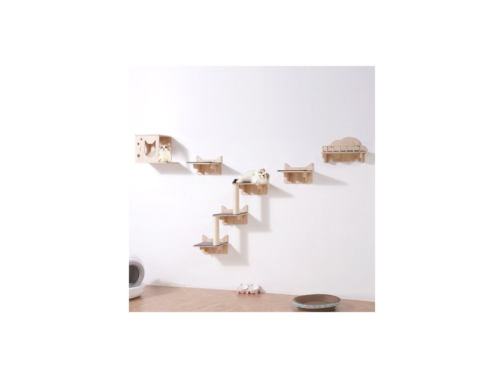 Nástěnné kočičí police , nástěnné police a bidýlka pro kočky se skákacími prkny, hnízdem, zábradlím a kočičím stromem, plovoucí kočičí nábytek do 18 kg na spaní, hraní a lezení, sada 5 kusů