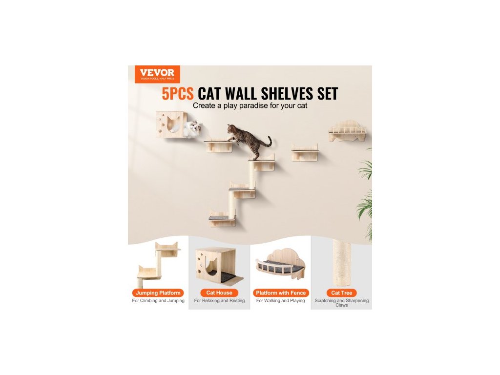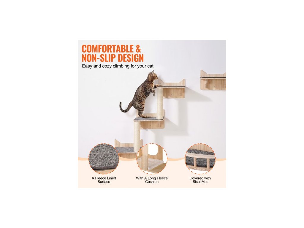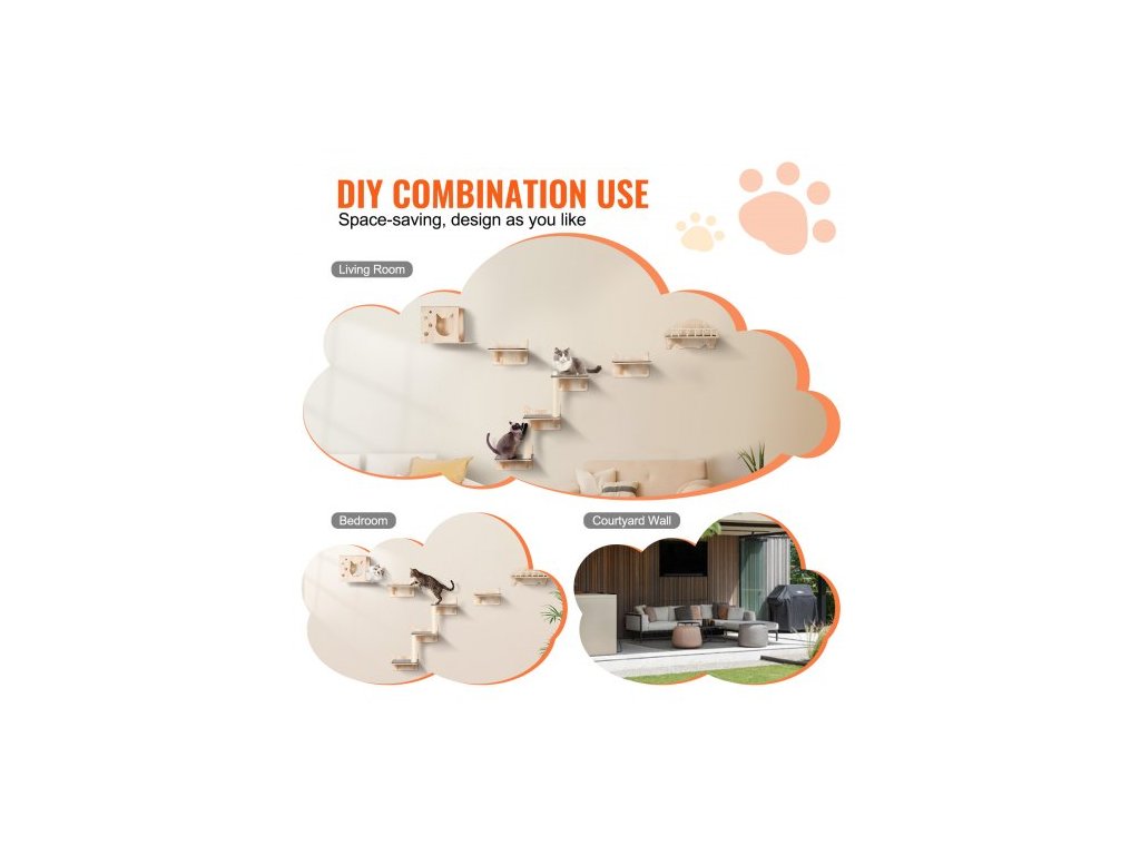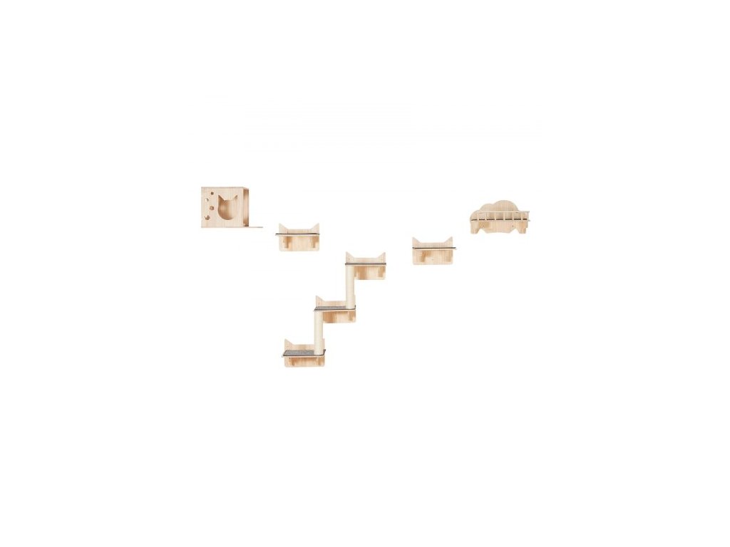 Nástěnné kočičí police , nástěnné police a bidýlka pro kočky se skákacími prkny, hnízdem, zábradlím a kočičím stromem, plovoucí kočičí nábytek do 18 kg na spaní, hraní a lezení, sada 5 kusů