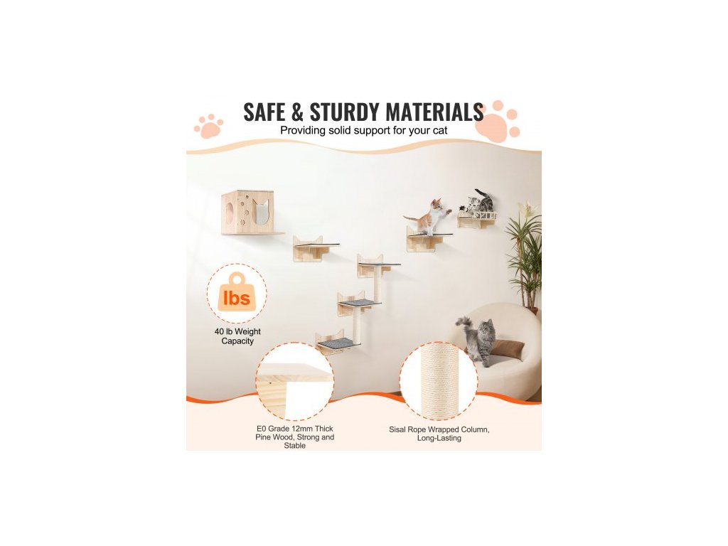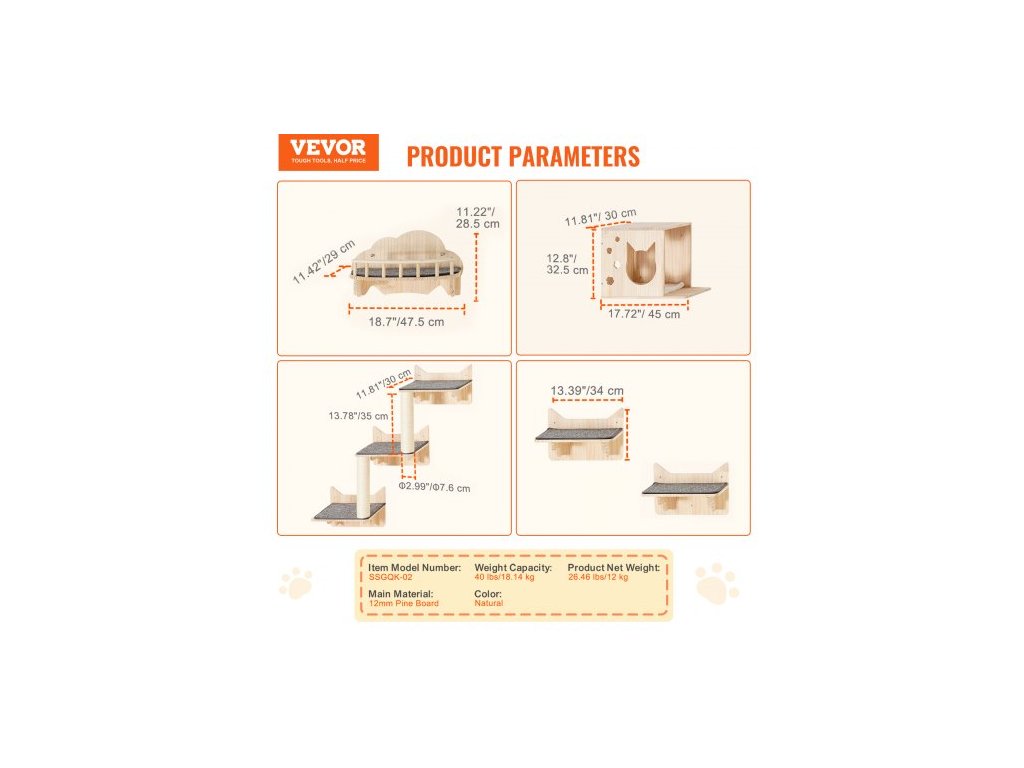 Rozměry plotové plošiny: 47,5 x 29 x 28,5 cm, Nosnost: 18,14 kg, Barva: Přírodní, Rozměry skákací plošiny: 34 x 30 x 24 cm, Číslo modelu položky: SSGQK-02, Čistá hmotnost výrobku: 12 kg, Hlavní materiál: Borovicové dřevo 12 mm, rozměry kočičího domečku: 17,72"x11,81"x12,8"/45x30x32,5 cm, rozměry sloupku: φ2,99"x13,78"/φ7,6 x 35 cm