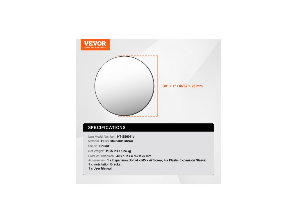 Tvar: Kulatý,Rozměry výrobku: 30 x 1 palec / Φ762 x 25 mm,Číslo modelu položky: HT-SS0011b,Materiál: HD udržitelné zrcadlo,Čistá hmotnost: 11,55 lbs / 5,24 kg