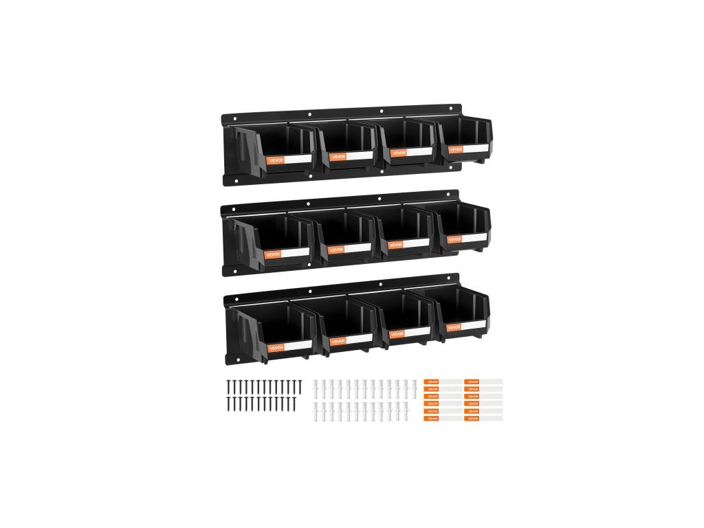 Nástěnné úložné boxy , 12 plastových boxů a 3 kovové lišty, plastový závěsný stohovatelný úložný box na šrouby, matice, šrouby, hřebíky, organizér na nářadí do dílny, řemeslné místnosti, garáže, černýVroubkovaný otvor pro štítky