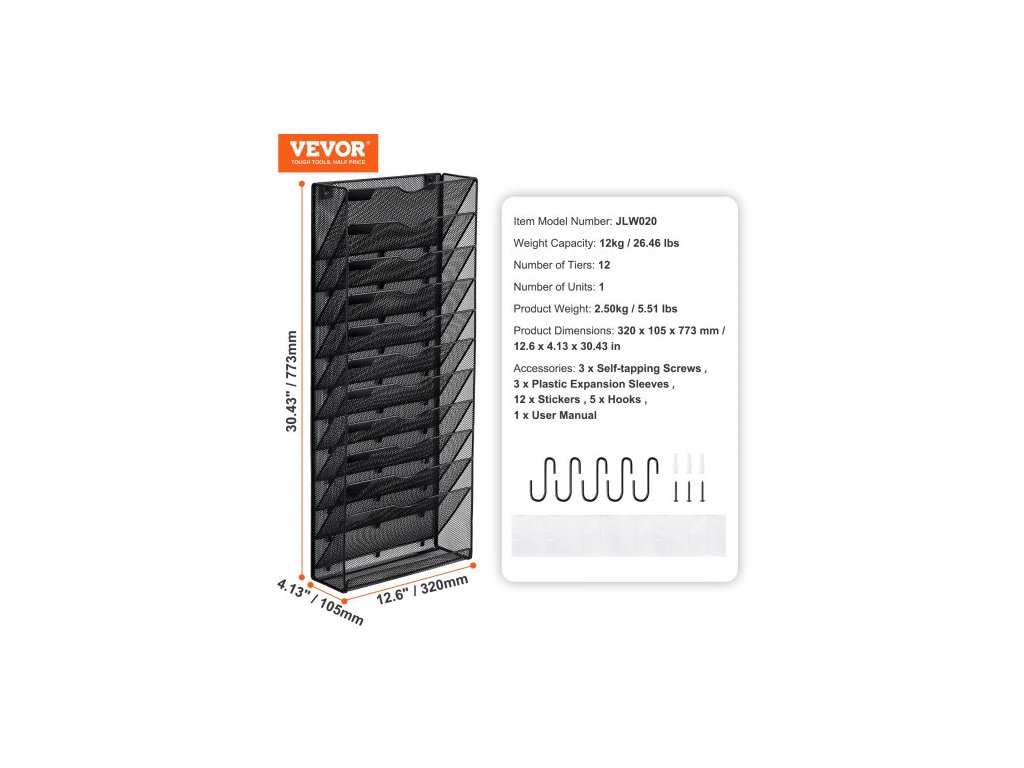 Nosnost: 12 kg / 26,46 lbs,Počet jednotek: 1,Počet úrovní: 12,Číslo modelu položky: JLW020,Hmotnost výrobku: 2,50 kg / 5,51 lbs,Rozměry výrobku: 105 x 320 x 773 mm / 12,68 x 4,13 x 25,59 palců