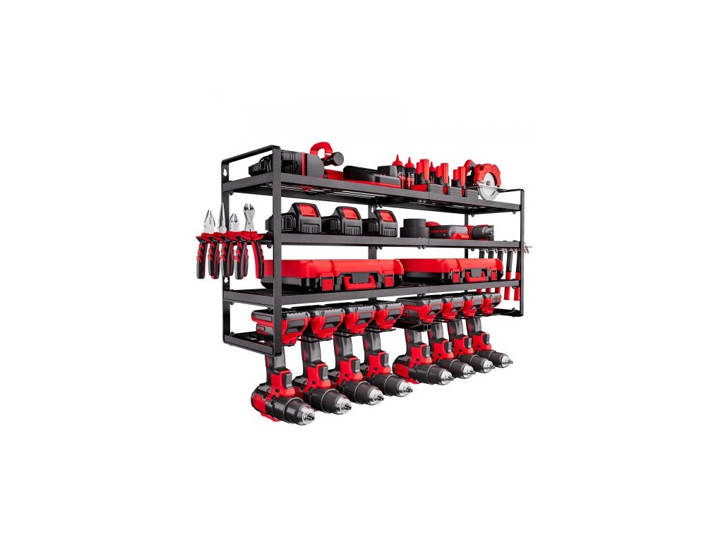 Nástěnný organizér na elektrické nářadí , 4vrstvý úložný stojan s 8 držáky na vrtáky, držákem na nářadí a úložným stojanem s držákem na šroubováky, organizér na nářadí do garáže, na pracovní stůl a do dílnyEfektivní úložný prostor
