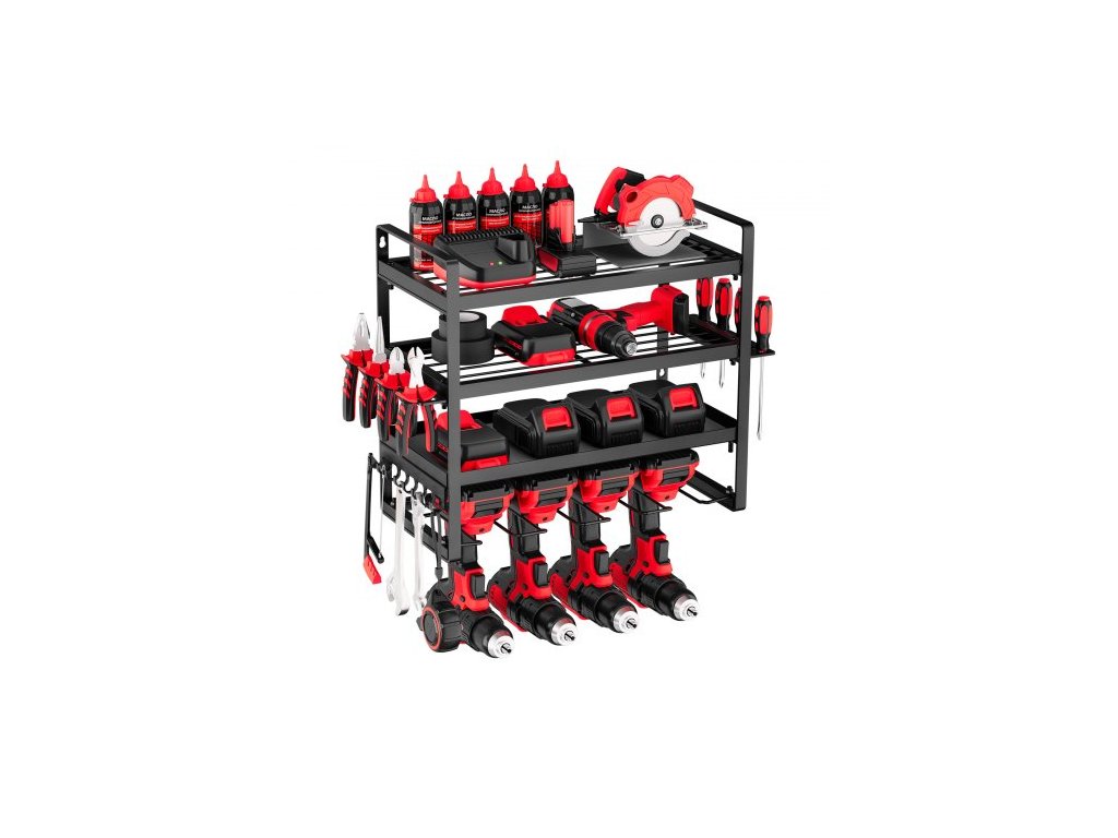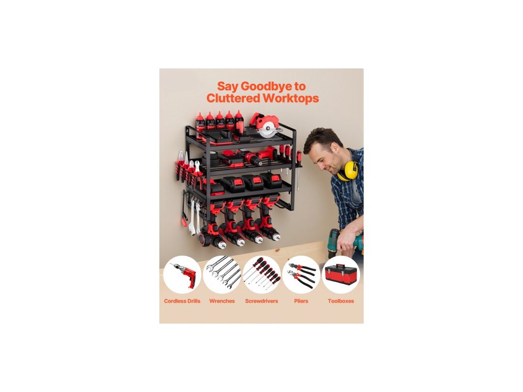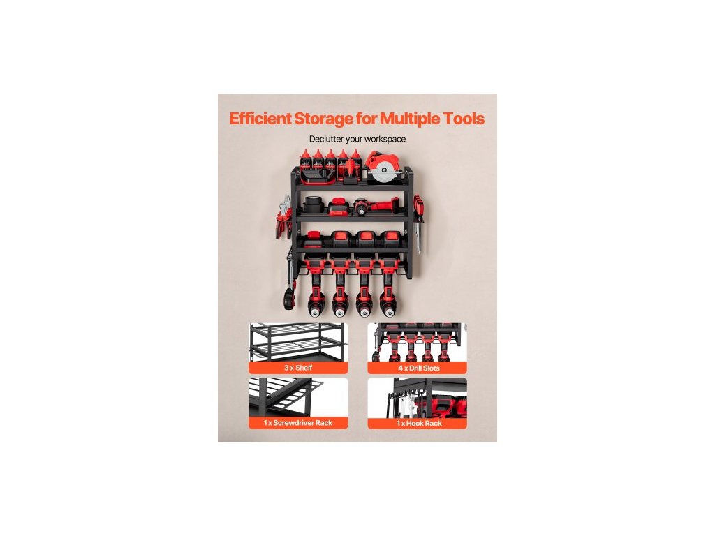 Nástěnný organizér na elektrické nářadí , 4vrstvý úložný stojan se 4 držáky na vrtáky, držákem na nářadí a úložným stojanem s držákem na šroubováky, organizér na nářadí do garáže, na pracovní stůl a do dílnyEfektivní úložný prostor