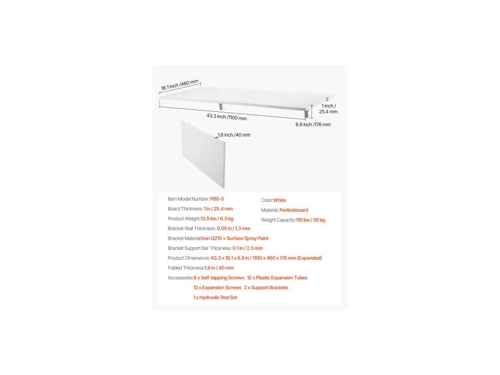 Rozměry výrobku (rozložené): 43,31 x 18,11 x 6,93 palce/1100 x 460 x 176 mm,Povrchová úprava držáku: Barva,Nosnost: 110 lbs/50 kg,Rozměry: 43,31 x 18,11 palce/1100 x 460 mm,Číslo modelu položky: PBS-5,Hmotnost výrobku: 13,89 lbs/6,3 kg,Materiál: Dřevotříska,Materiál držáku: Železo Q215, Tloušťka desky: 25,4 mm