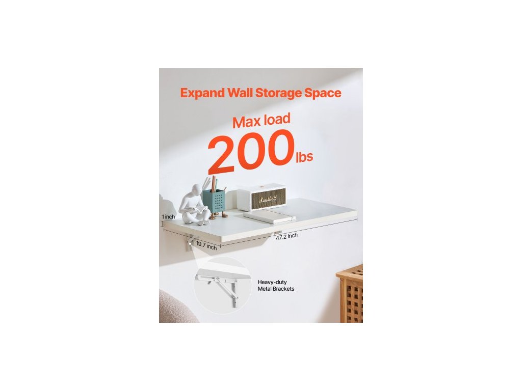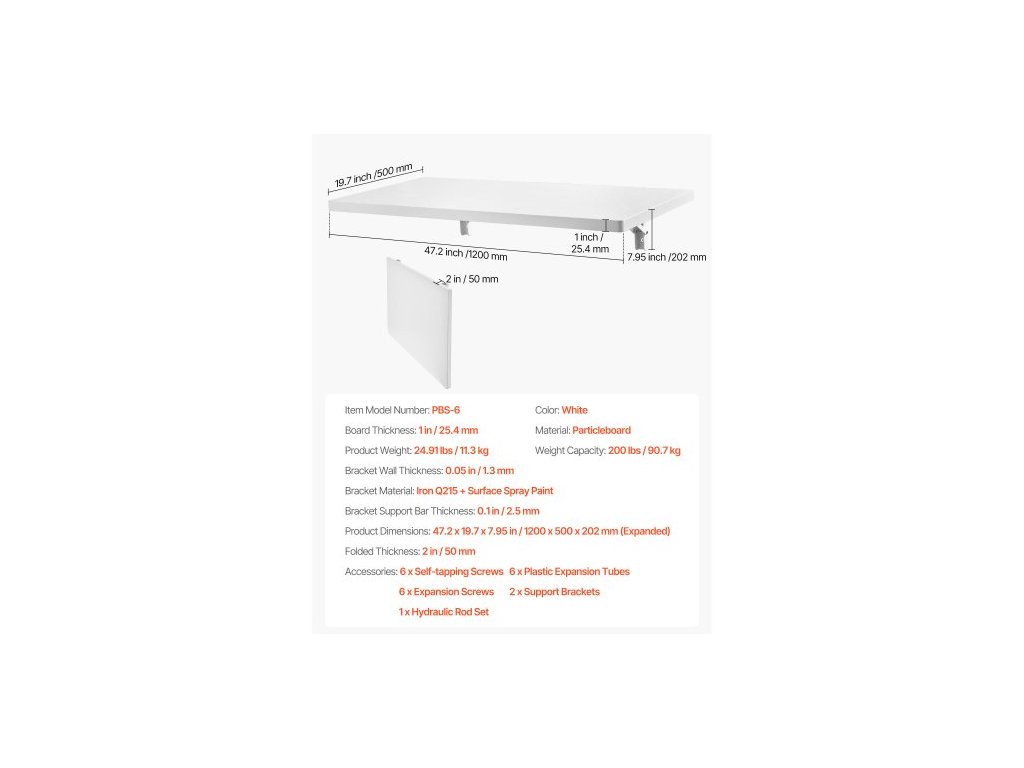 Rozměry výrobku (rozložené): 47,24 x 19,69 x 7,95 palce/1200 x 500 x 202 mm,Povrchová úprava držáku: Barva,Nosnost: 200 lbs/91 kg,Rozměry: 47,24 x 19,69 palce/1200 x 500 mm,Číslo modelu položky: PBS-6,Hmotnost výrobku: 24,91 lbs/11,3 kg,Materiál: Dřevotříska,Držák Materiál: Železo Q215, Tloušťka desky: 25,4 mm