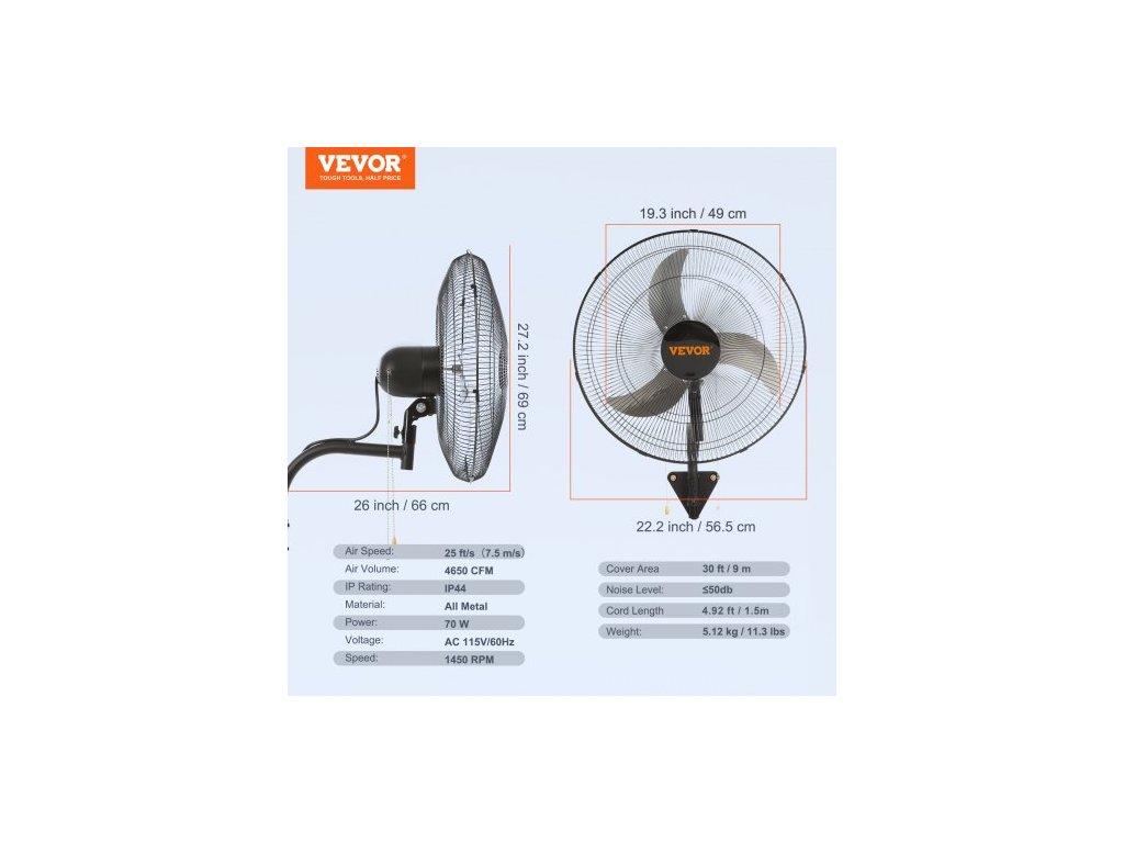 Dosah: 9 m, Výkon: 70 W, Rychlost vzduchu: 7 m/s, Objem vzduchu: 4650 CFM, Hmotnost: 5,12 kg, Rychlost: 1450 ot/min, Délka kabelu: 1,5 m, Číslo modelu položky: VV-BGSFS20, Hladina hluku: ≤ 50 dB, Materiál: celokovový, Průměr lopatek ventilátoru: 49 cm