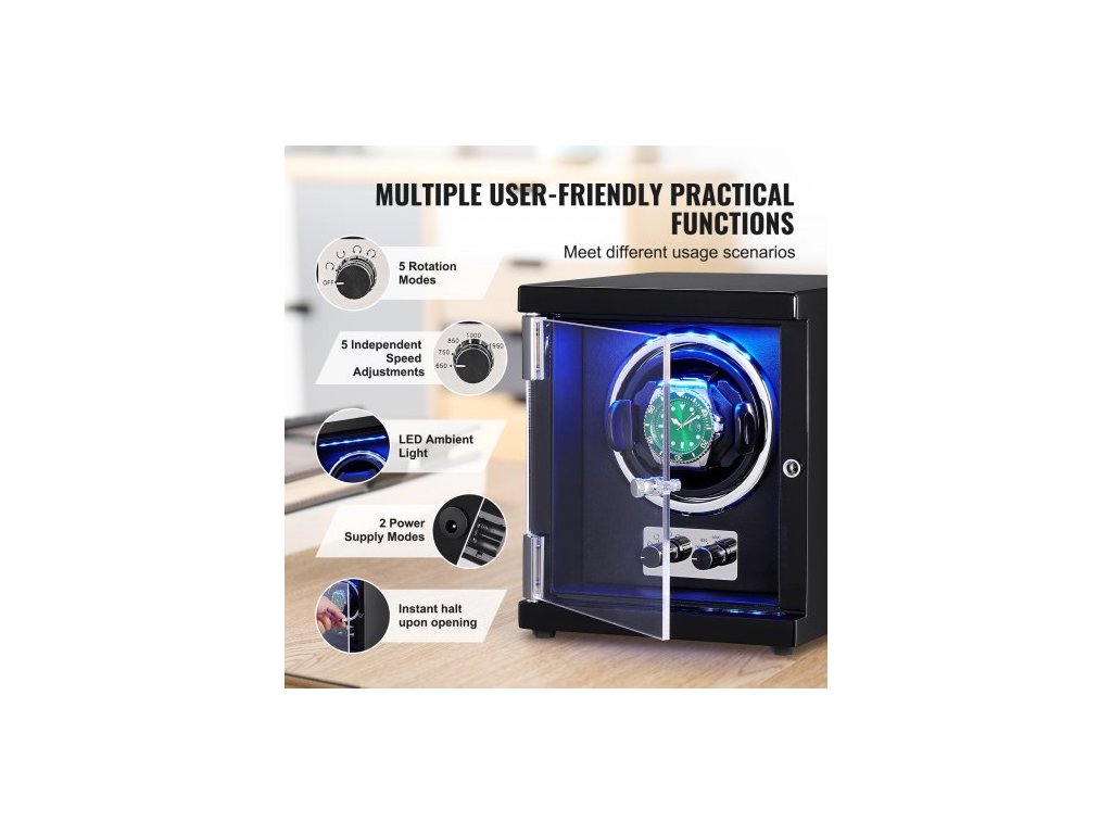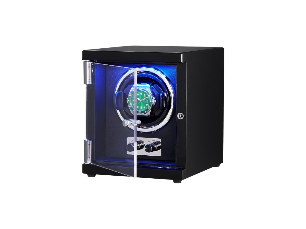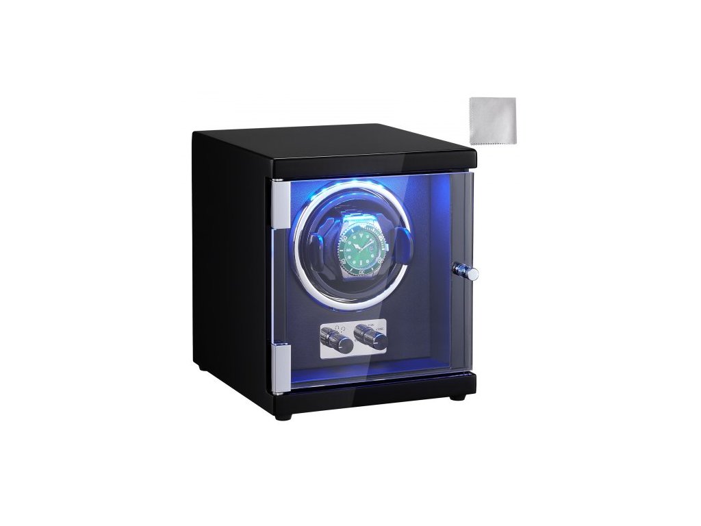 Natahovač hodinek , automatický natahovač hodinek pro muže i ženy, s velmi tichým japonským motorem Mabuchi, modrým LED světlem a adaptérem, pouzdrem z vysoce husté desky a černým PU