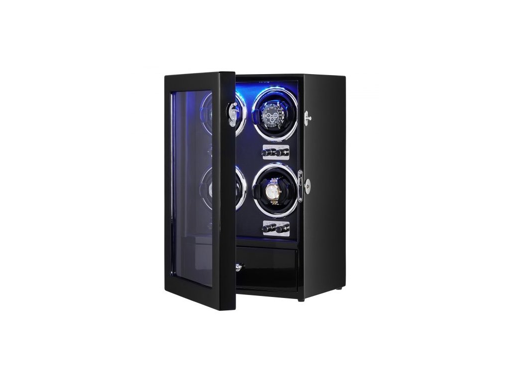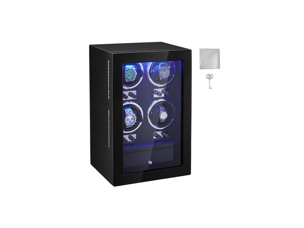 Natahovač hodinek , natahovač hodinek pro 4 pánské a dámské automatické hodinky, se 4 super tichými japonskými motory Mabuchi, modrým LED světlem a adaptérem, pouzdrem z vysoce husté desky a černým PU
