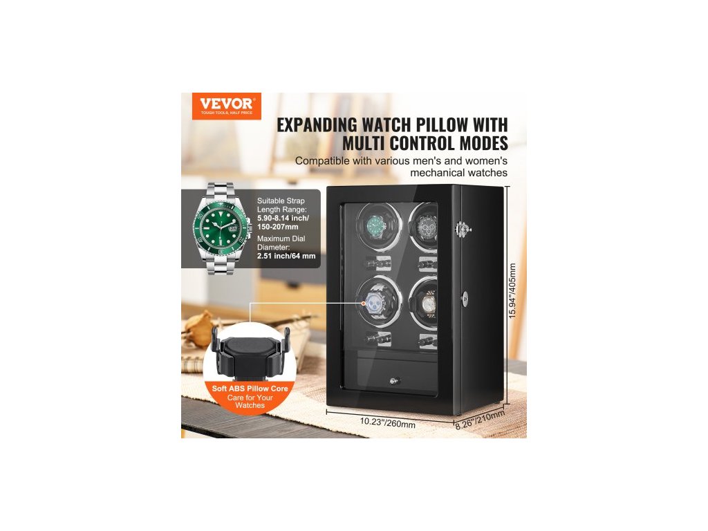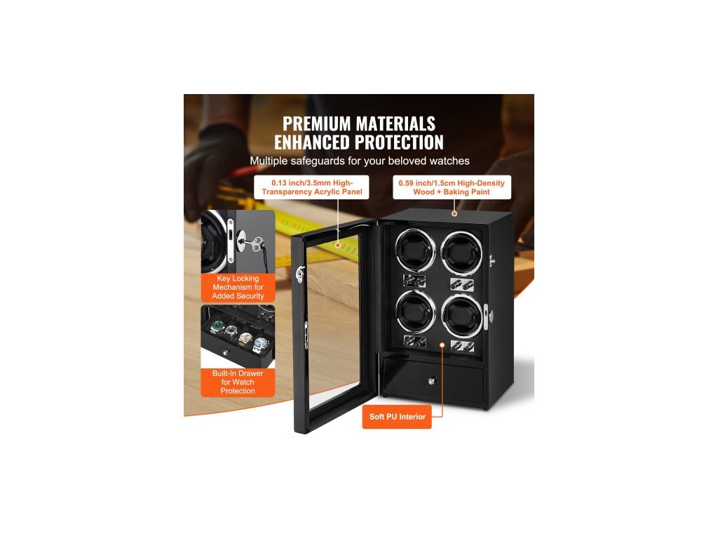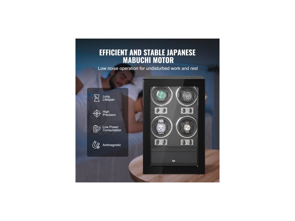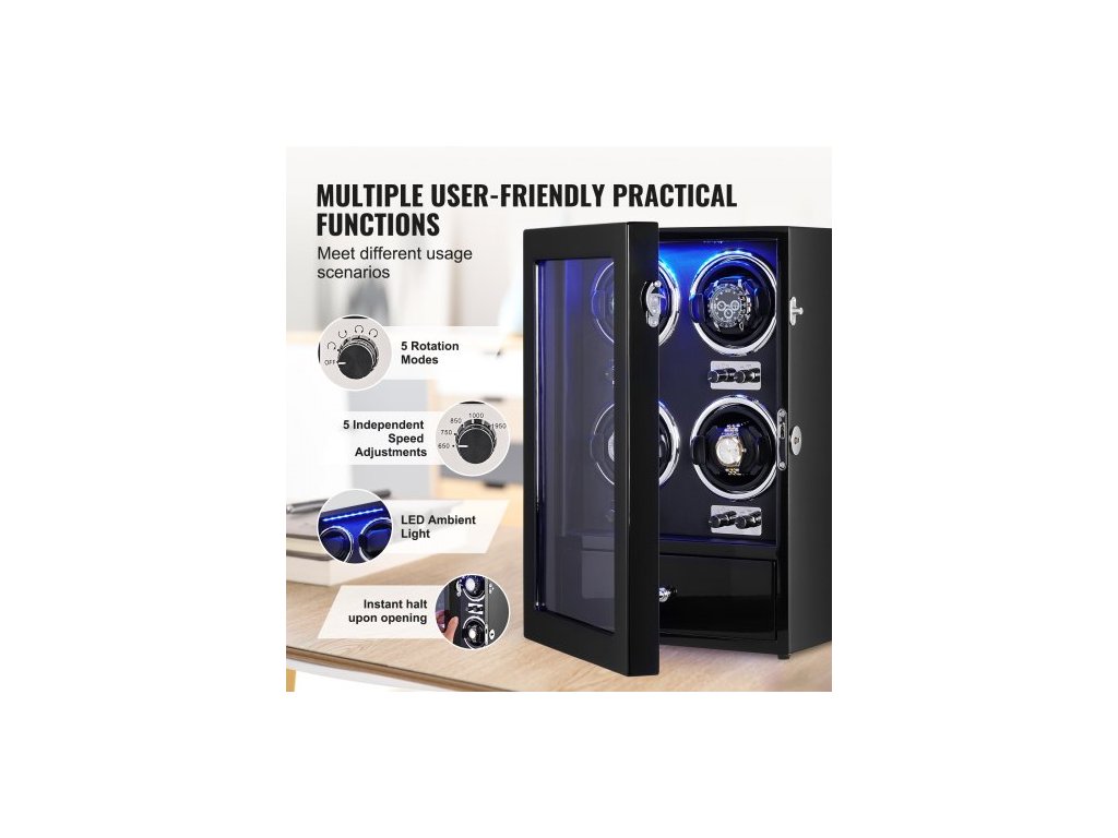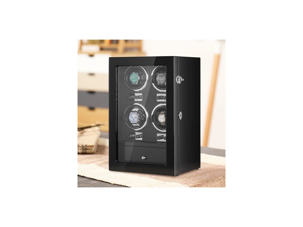 Natahovač hodinek , natahovač hodinek pro 4 pánské a dámské automatické hodinky, se 4 super tichými japonskými motory Mabuchi, modrým LED světlem a adaptérem, skořepinou z vysoce husté lepenky a černým PUVysoce kvalitní natahovač hodinek