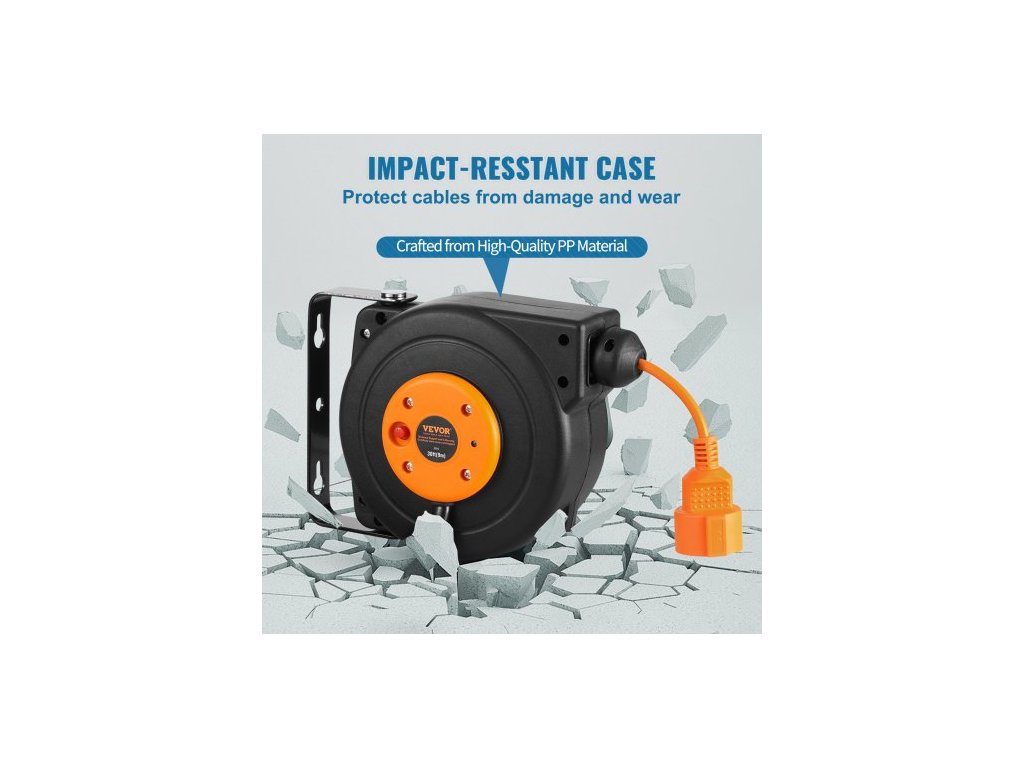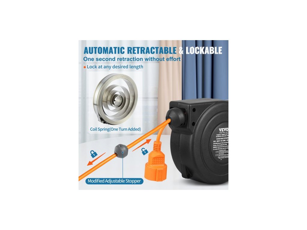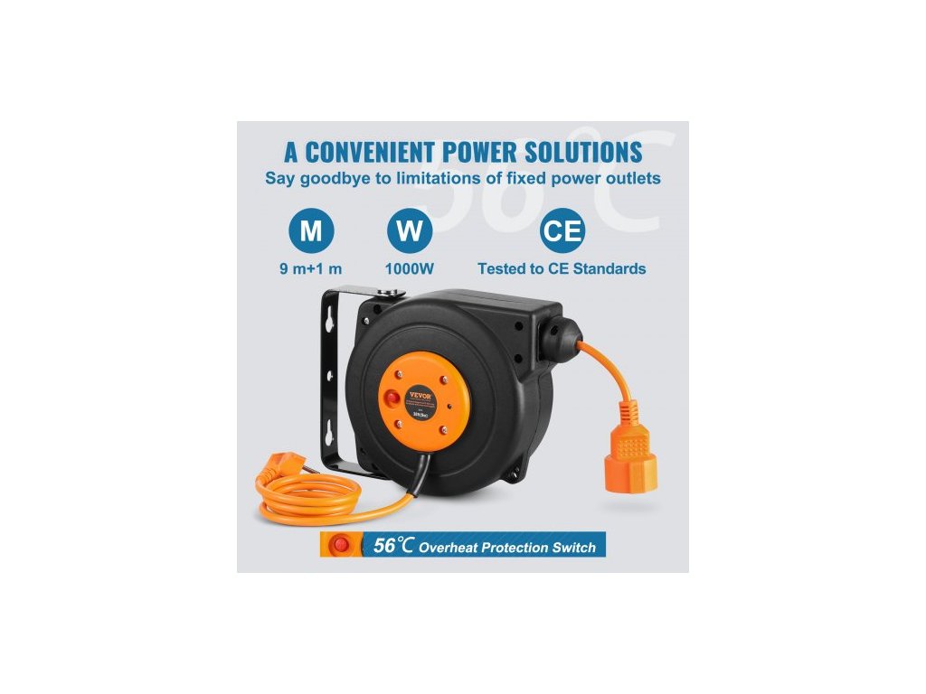 Navíjecí prodlužovací kabel na cívce, 9 m, 1000W odolný navíjecí napájecí kabel s přívodním kabelem o délce 1 m, ochranou proti přehřátí a nastavitelnou zarážkou, pro montáž na strop nebo na zeďSnadný přístup k elektřině