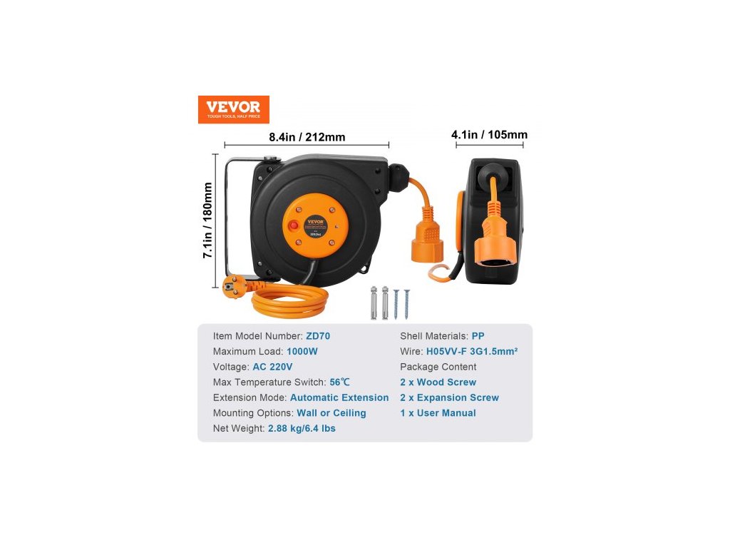Režim prodloužení: Automatické prodloužení, Maximální zatížení: 1000 W, Možnosti montáže: Na zeď nebo na strop, Napětí: AC 220 V, Číslo modelu položky: ZX-ZD70, Materiál pláště: PP, Maximální teplotní spínač: 56 ℃, Vodič: H05VV-F 3G1,5 mm², Čistá hmotnost: 2,88 kg/6,4 lbs