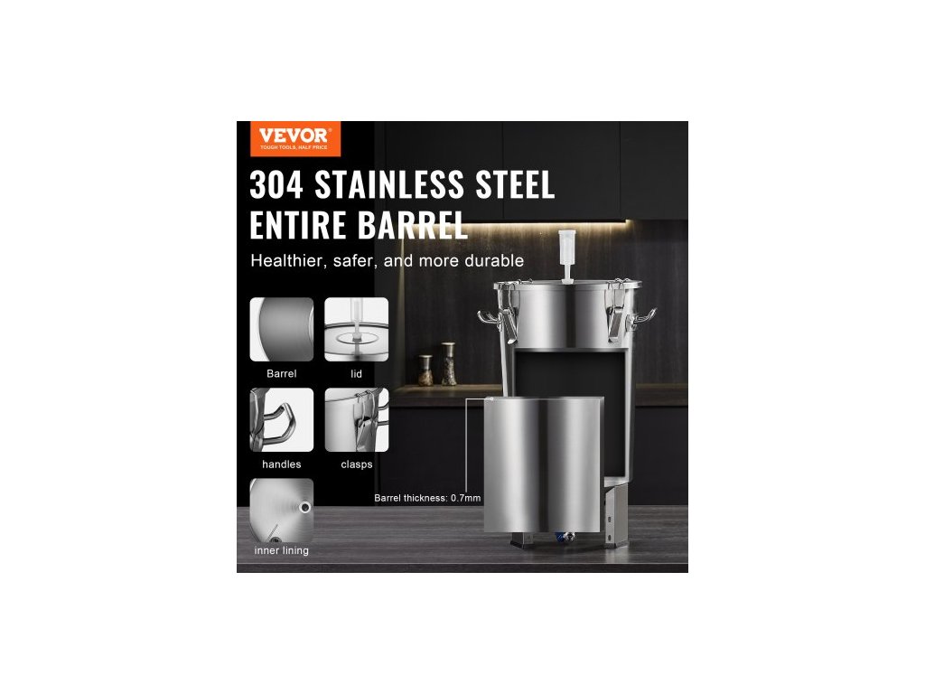 Materiál sudu: nerezová ocel 304,Objem výrobku: 30 l ±10 %,Tloušťka sudu: 0,7 mm,Číslo modelu položky: DM-F300,Hmotnost výrobku: 4,1 kg ±3 % (včetně veškerého příslušenství),Rozměry výrobku (DxŠxV): 395x330x695 mm
