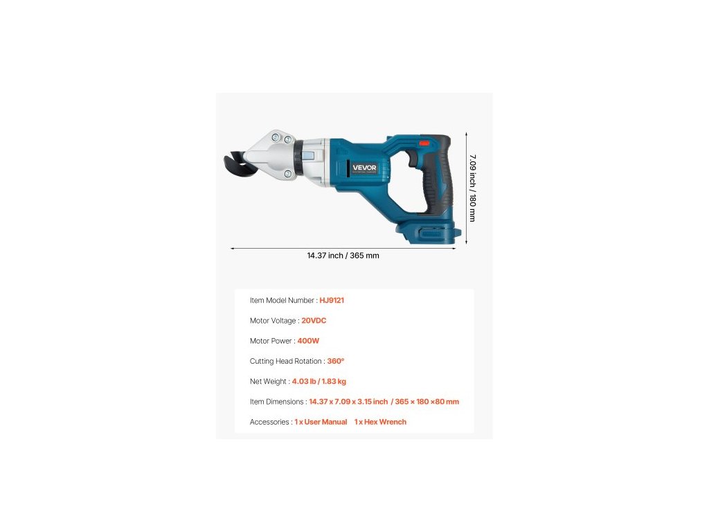 Typ čepele: Dvojité čepele, Napětí motoru: 20 V DC, Materiál pouzdra: Nylon, Barva: Stříbrná + modrá, Číslo modelu položky: HJ9121, Výkon motoru: 400 W, Vlastnosti: Spoušť citlivá na tlak se dvěma prsty + bezpečnostní spínač, Rozměry položky: 14,37 x 7,09 x 3,15 palce / 365 x 180 x 80 mm, Materiál řezací hlavy: Legovaná nástrojová ocel, Čistá hmotnost: 4,03 lbs / 1,83 kg, Max. řezná kapacita: pozinkovaná ocel 18 GA, nerezová ocel 20 GA, otáčení řezné hlavy: 360°