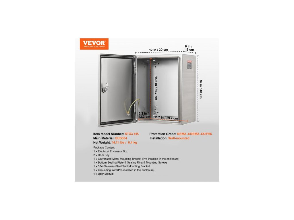 Vnitřní rozměry: 15,6 x 11,7 x 5,2 palce / 39,7 x 29,7 x 13,3 cm,Instalace: Nástěnná,Číslo modelu položky: SP-B3-403015,Rozměry spodního vývodu: 5,1 x 2 palce / 13 x 5 cm,Stupeň krytí: NEMA 4/NEMA 4X/IP66,Čistá hmotnost: 12,3 lbs / 5,6 kg, Hlavní materiál: SUS304, Celkové rozměry: 16 x 12 x 6 palců / 40 x 30 x 15 cm