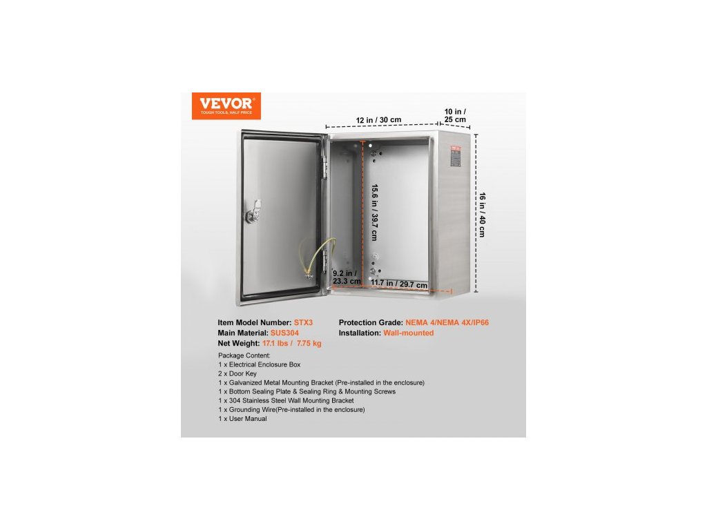 Vnitřní rozměry: 15,6 x 11,7 x 9,2 palce / 39,7 x 29,7 x 23,3 cm,Instalace: Nástěnná,Číslo modelu položky: SP-B3-403025,Rozměry spodního vývodu: 6,7 x 2 palce / 17 x 5 cm,Stupeň krytí: NEMA 4/NEMA 4X/IP66,Čistá hmotnost: 15,2 lbs / 6,9 kg,Hlavní materiál: SUS304, Celkové rozměry: 16 x 12 x 10 palců / 40 x 30 x 25 cm