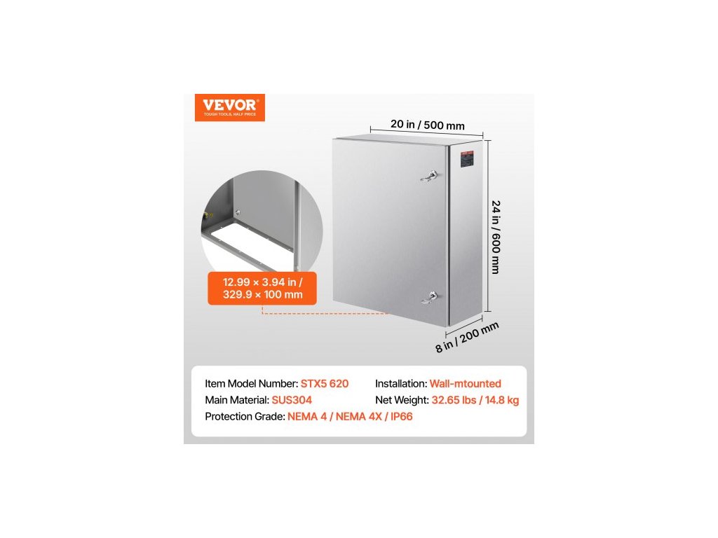 Vnitřní rozměry: 23,5 x 19,6 x 7,2 palce / 59,7 x 49,7 x 18,3 cm,Instalace: Nástěnná,Číslo modelu položky: SP-B3-605020,Rozměry spodního vývodu: 13 x 3,9 palce / 33 x 10 cm,Stupeň krytí: NEMA 4/NEMA 4X/IP66,Čistá hmotnost: 28,9 lbs / 13,1 kg,Hlavní Materiál: SUS304, Celkové rozměry: 60 x 50 x 20 cm