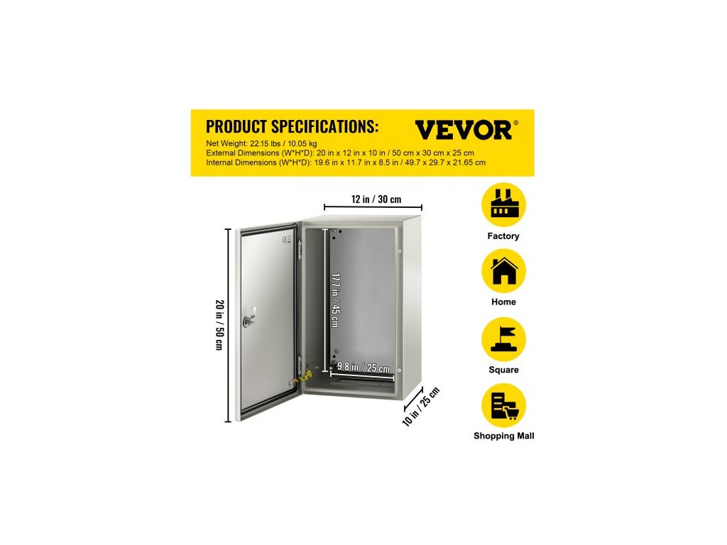 Vnitřní rozměry (V x Š x H): 19,6'' x 11,7'' x 8,5'' / 49,7 x 29,7 x 21,65 cm,Barva: Šedobílá (RAL7035),Materiál: 0,059'' / 1,5 mm uhlíková ocel,Vlastnosti: Uzamykatelné, vodotěsné,Certifikace: Certifikace CE / ROHS,Montážní deska: 0,079'' / 2 mm odnímatelná pozinkovaná Zadní deska, Krytí IP: Navrženo pro splnění specifikací IP66 a NEMA 1, 2, 4, 4X a 12, Vnější rozměry (V x Š x H): 50 x 30 x 25 cm, Rozměry pozinkované zadní desky: 45 x 25 cm, Typ připojení: Kloubové, Model: SPT, Hmotnost výrobku: 12,8 kg, Povrchová úprava: Epoxidový polyesterový práškový lak