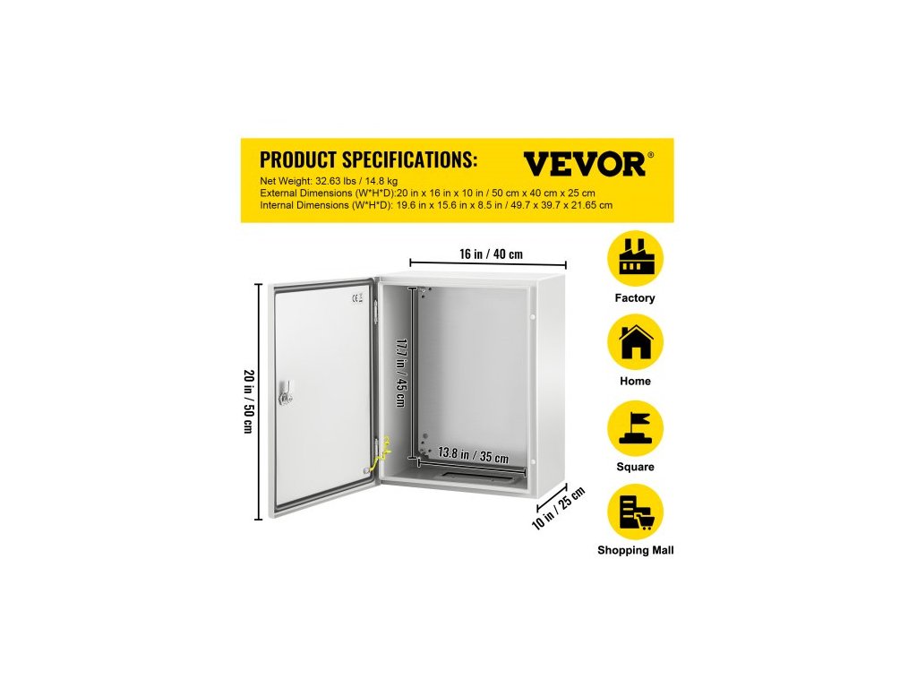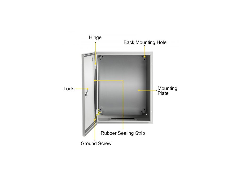 Vnitřní rozměry (V x Š x H): 19,6'' x 15,6'' x 8,5'' / 49,7 x 39,7 x 21,65 cm,Barva: Šedobílá (RAL7035),Materiál: 0,059'' / 1,5 mm uhlíková ocel,Vlastnosti: Uzamykatelná, vodotěsná,Certifikace: Schváleno CE / ROHS,Montážní deska: 0,079'' / 2 mm odnímatelná pozinkovaná zadní deska,Krytí IP: Navrženo pro splnění Specifikace IP66 a NEMA 1, 2, 4, 4X a 12, Vnější rozměry (V x Š x H): 50 x 40 x 25 cm, Rozměry pozinkované zadní desky: 45 x 35 cm, Typ připojení: Sklápěcí, Model: SPT, Povrchová úprava: Epoxidový polyesterový práškový lak, Čistá hmotnost: 14,8 kg