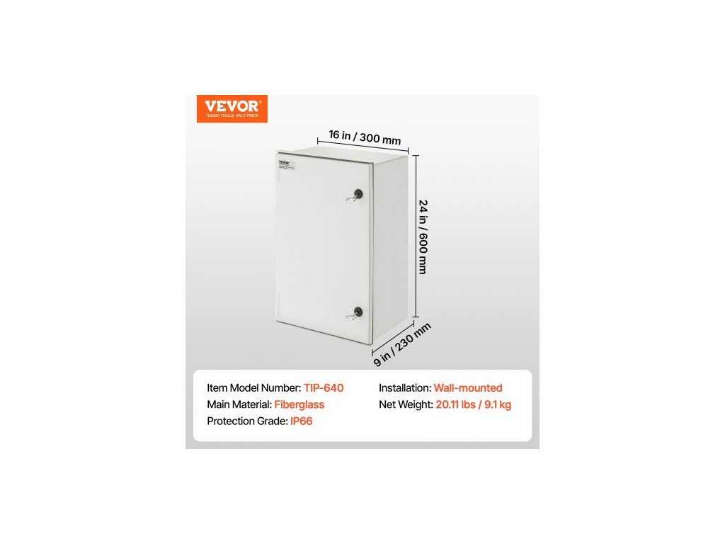 Vnější rozměry (V x Š x H): 23,6 x 15,7 x 9,1"/60 x 40 x 23 cm,Vnitřní rozměry (V x Š x H): 22,6 x 15,6 x 8,7"/57,5 x 39,5 x 22 cm,Montážní deska: Pozinkovaná zadní deska,Krytí IP: IP66,Materiál: SMC,Typ montáže: Nástěnná montáž,Čistá hmotnost: 22,71 lbs/10,3 kg, Použití: Vnitřní/Venkovní, Hodnocení NEMA: NEMA typ 3, 3X