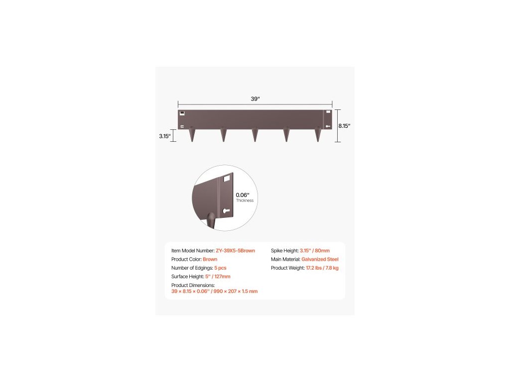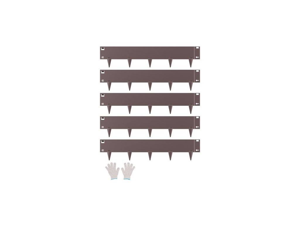 Výška povrchu: 127 mm, Počet lemů: 5 ks, Barva produktu: Hnědá, Číslo modelu položky: ZY-39X5-5Brown, Hmotnost produktu: 7,8 kg, Rozměry produktu: 990 x 207 x 1,5 mm, Výška hrotů: 80 mm, Hlavní materiál: Pozinkovaná ocel