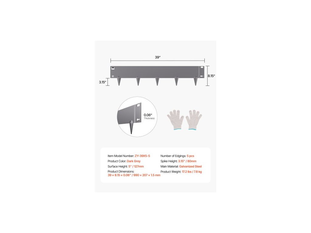 Výška povrchu: 127 mm, počet lemů: 5 ks, barva produktu: tmavě šedá, číslo modelu položky: ZY-39X5-5, hmotnost produktu: 7,8 kg, rozměry produktu: 990 x 207 x 1,5 mm, výška hrotů: 80 mm, hlavní materiál: pozinkovaná ocel