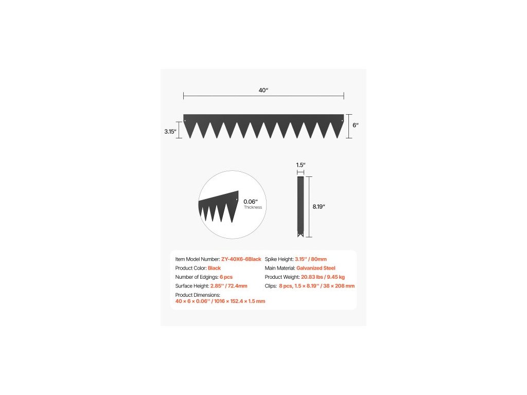 Výška povrchu: 2,85 palce / 72,4 mm,Klipy: 8 ks, 1,5 x 8,19 palce / 38 x 208 mm,Počet lemů: 6 ks,Barva produktu: Černá,Číslo modelu položky: ZY-40X6-6Black,Hmotnost produktu: 20,83 lbs / 9,45 kg,Rozměry produktu: 40 x 6 x 0,06 palce / 1016 x 152,4 x 1,5 mm, Výška hrotu: 80 mm, Hlavní materiál: Pozinkovaná ocel