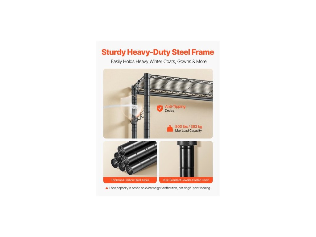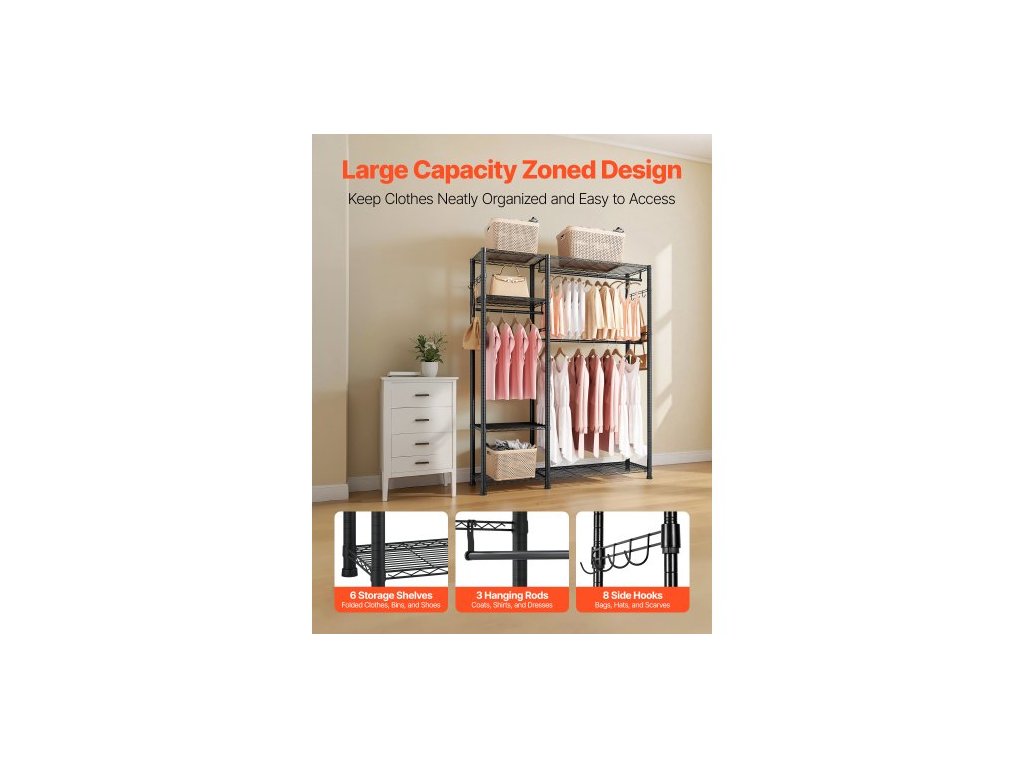 Věšák na oblečení, Odolný věšák na oblečení, 6 nastavitelných úrovní věšáků na oblečení s ocelovým rámem, nosnost 363 kg, šatní skříň se 3 závěsnými tyčemi do ložnice, obchodu s oblečením, chodbyVěšák na oblečení