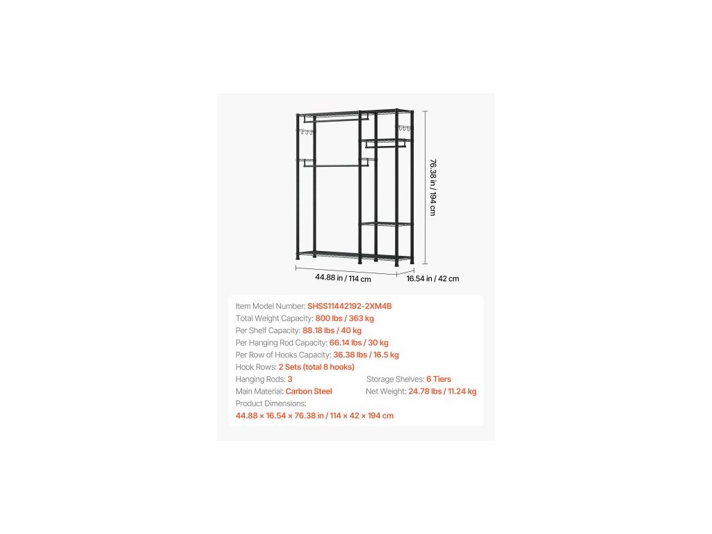 Nosnost na polici: 40 kg, Nosnost na řadu háčků: 16,5 kg, Řady háčků: 2 sady (celkem 8 háčků), Celková nosnost: 363 kg, Úložné police: 6 úrovní, Závěsné tyče: 3, Číslo modelu položky: SHSS11442192-2XM4B, Rozměry výrobku: 44,88 x 16,54 x 76,38 palce / 114 x 42 x 194 cm, Nosnost na závěsnou tyč: 66,14 liber / 30 kg, Čistá hmotnost: 24,78 liber / 11,24 kg, Hlavní materiál: Uhlíková ocel