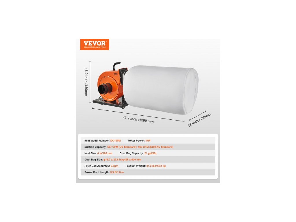 Rozměry sáčku na prach: φ16,7 x 23,6 palce/φ425 x 600 mm,Délka napájecího kabelu: 5,9 stop/1,8 m,Velikost vstupu: 4 palce/100 mm,Přesnost filtračního sáčku: 2,5 μm,Číslo modelu položky: DC100M,Objem sáčku na prach: 21 gal/80 l,Hmotnost výrobku: 31,3 lbs/14,2 kg,Výkon motoru: 1 HP,Sací kapacita: 460 CFM