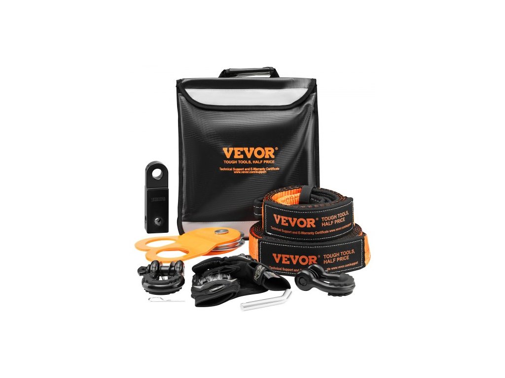 Odtahová sada pro terénní vozidlo, 7,6 x 914,4 cm, Vysoce odolná odtahová sada s navijákem, tažnými popruhy o hmotnosti 13 608 kg, třmeny s D-kroužky o hmotnosti 20 000 kg, uchycečem třmenu, kladkou s kladkou, rukavicemi, úložným vakem pro čtyřkolku,