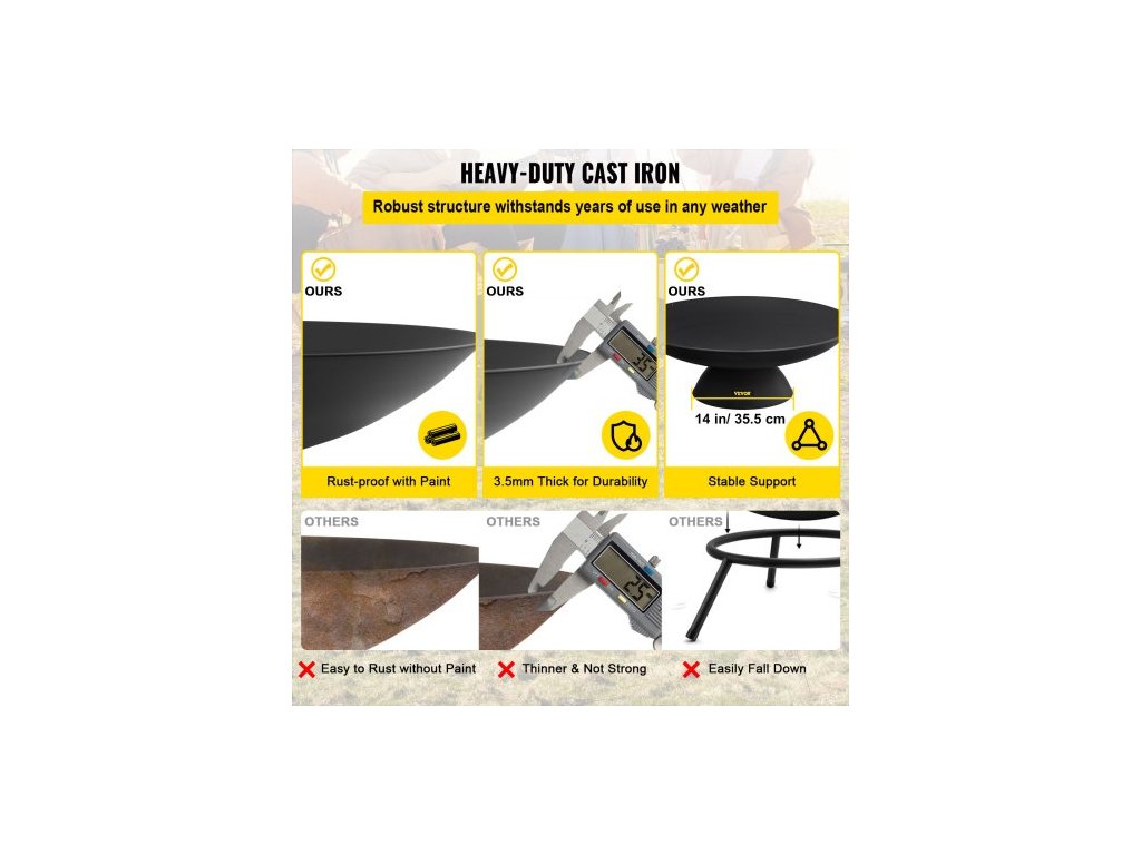 Průměr ohniště: 76 cm,Průměr základny: 35,5 cm,Hloubka ohniště: 14 cm,Výška ohniště: 28 cm,Model: VV-FPB-30.5,Tloušťka ohniště: 3,5 mm,Materiál: Černě lakovaná litina,Hmotnost: 16 kg