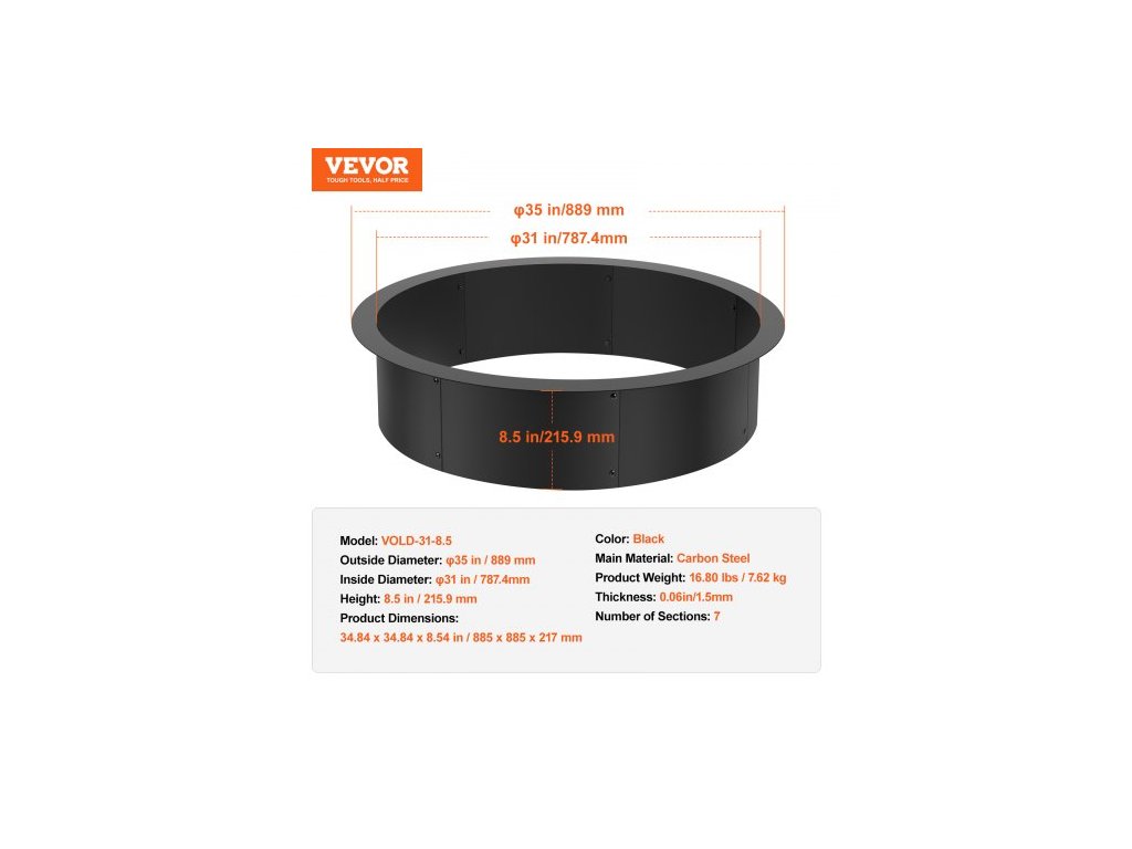 Tloušťka: 0,06 palce / 1,5 mm,Počet sekcí: 7,Vnitřní průměr: φ39 palců / 990,6 mm,Barva: Černá,Model: VOLD-31-8.5,Hmotnost výrobku: 19,47 lbs / 8,83 kg,Výška: 8,5 palců / 215,9 mm,Vnější průměr: φ45 palců / 1143 mm,Rozměry výrobku: 39,96 x 39,96 x 8,50 palce / 1015 x 1015 x 216 mm, hlavní materiál: uhlíková ocel Q235