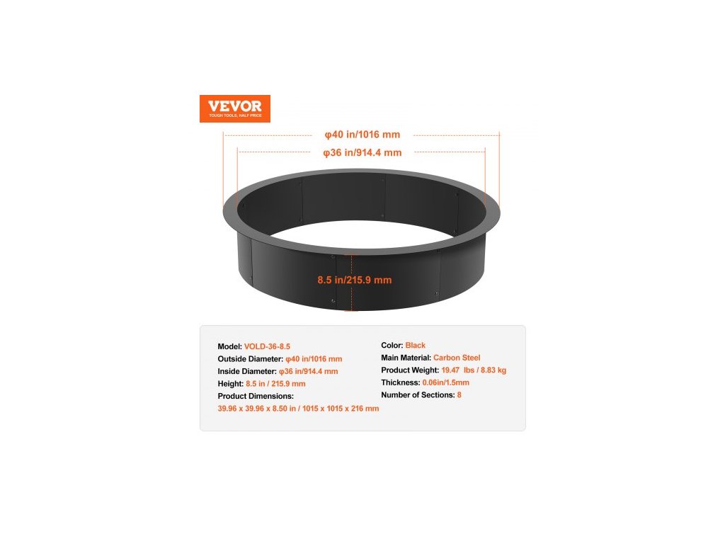 Tloušťka: 0,06 palce / 1,5 mm,Počet sekcí: 8,Vnitřní průměr: φ39 palců / 990,6 mm,Barva: Černá,Model: VOLD-36-8,5,Hmotnost výrobku: 19,47 lbs / 8,83 kg,Výška: 8,5 palců / 215,9 mm,Vnější průměr: φ40 palců / 1016 mm,Rozměry výrobku: 39,96 x 39,96 x 8,50 palce / 1015 x 1015 x 216 mm, hlavní materiál: uhlíková ocel Q235