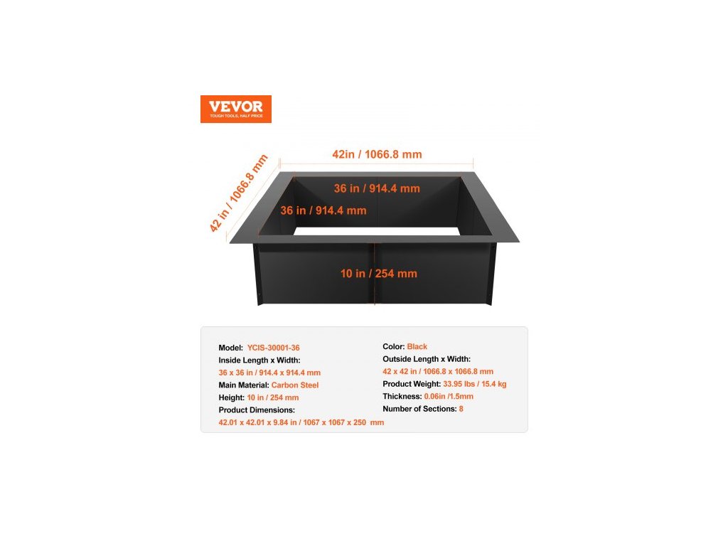 Tloušťka: 0,1 palce / 2,5 mm,Vnitřní délka x šířka: 36 x 36 palců / 914,4 x 914,4 mm,Počet sekcí: 8,Barva: Černá,Model: YCIS-30001-30,Hmotnost výrobku: 33,95 lbs / 15,4 kg,Výška: 10 palců / 254 mm,Vnější délka x šířka: 42 x 42 palců / 1066,8 x 1066,8 mm,Rozměry produktu: 42,01 x 42,01 x 9,84 palce / 1067 x 1067 x 250 mm,Hlavní materiál: Uhlíková ocel Q235