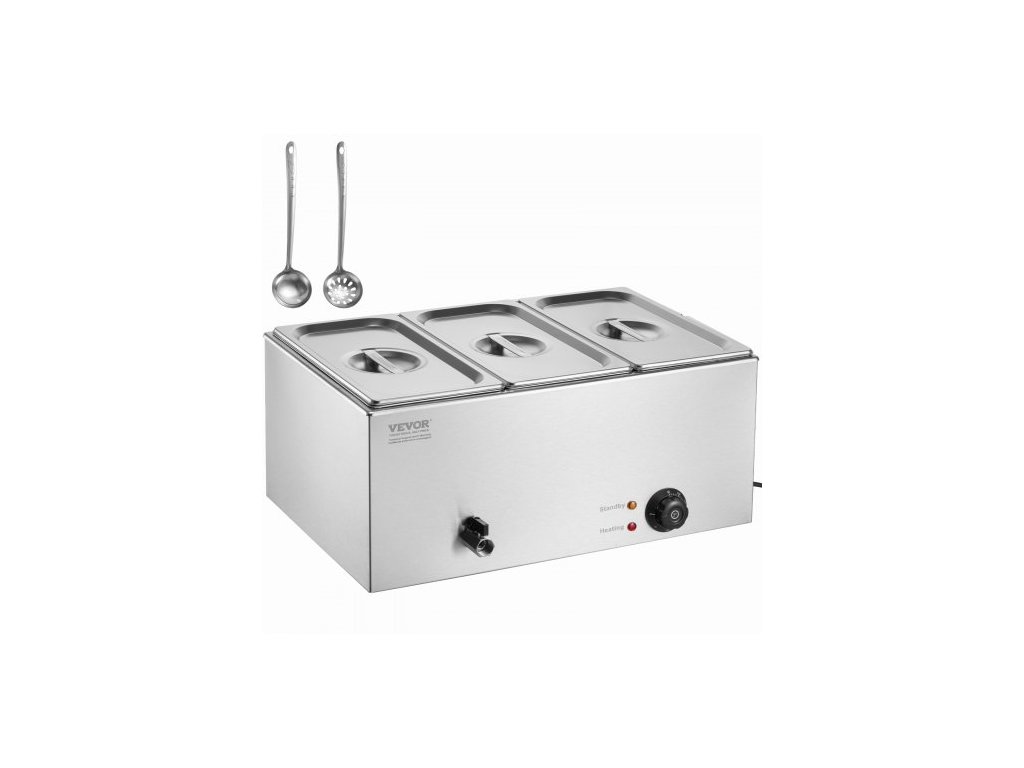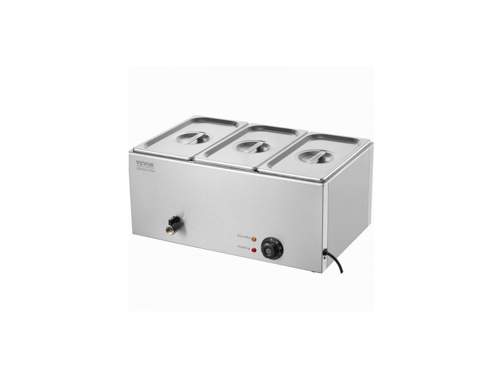 Ohřívač jídla se 3 pánvemi pro komerční použití, elektrický parní stůl o objemu 16,5 l, profesionální nerezový lázeňský bazén s výkonem 1200 W a regulací teploty 86-185 °F pro catering a restaurace, stříbrnýOhřívač jídla pro komerční použití