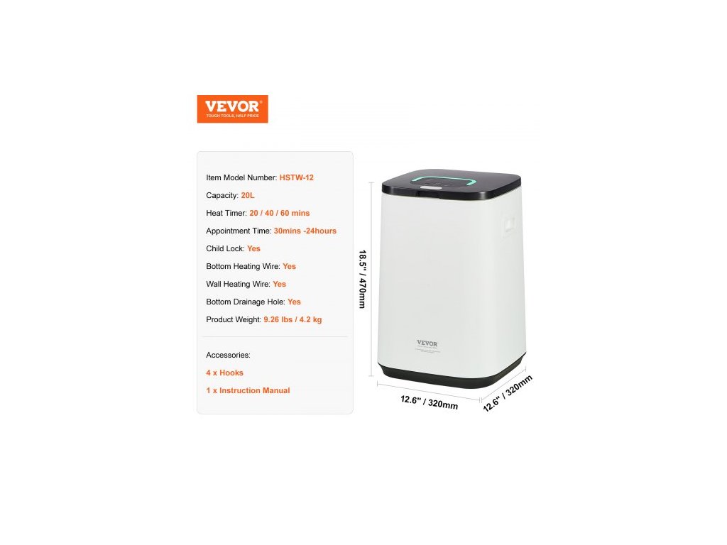 Dětská pojistka: Ano,Objem: 20 l,Funkce rezervace: 24hodinová rezervace,Číslo modelu položky: HSTW-12,Spodní odtokový otvor: Ano,Hmotnost výrobku: 4,2 kg,Spodní topný drát: Ano,Rozměry výrobku: 320 x 320 x 470 mm,Funkce časovače: 3 nastavení: 20/40/60 min