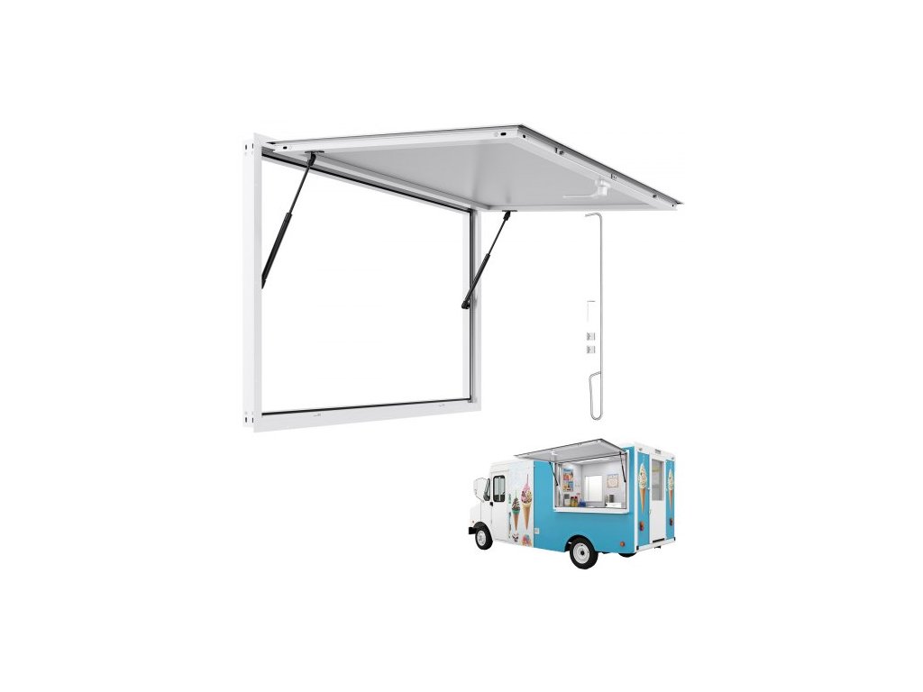 Okénko do občerstvení 135x84 cm, rám z hliníkové slitiny pro food truck, servírovací okno s úhlem otevření až 85 stupňů, markýza a tažný háček, odolné proti dešťové vodě pro občerstvovací přívěsHydraulická tyč