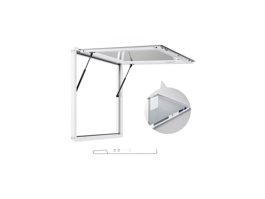 Okénko pro občerstvení 92x92 cm, Servírovací okénko s rámem z hliníkové slitiny pro pojízdné občerstvení, Výdejní okénko s úhlem otevření až 85 stupňů, markýza a tažný háček, Odolné proti dešťové vodě pro občerstvovací přívěsyHydraulická tyč